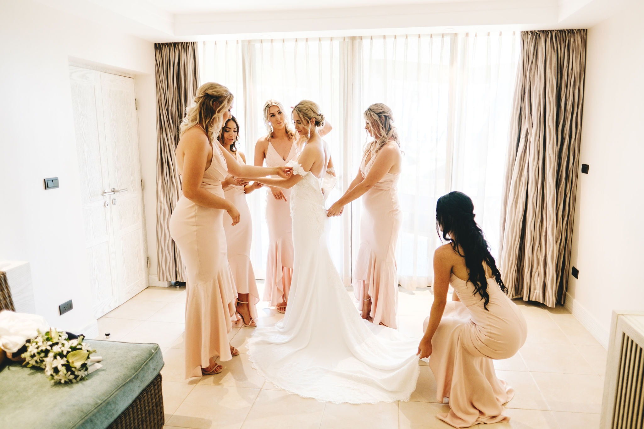 The bridesmaids and I started our morning with a beautiful breakfast in the adults only restaurant. We then headed to the on-site hair and beauty salon to begin our hair and make up process. It was great having the salon at the resort – this meant we didn’t need to do any additional running around on the day. We then finished getting ready in one of the suites at the resort. It was a beautiful suite with lots of room for all the bridesmaids and I to get dressed and get some lovely photos.