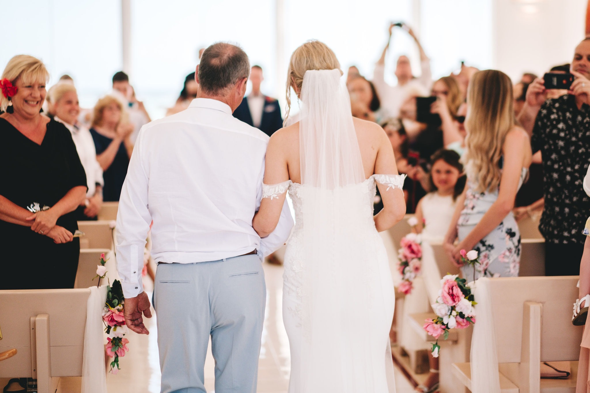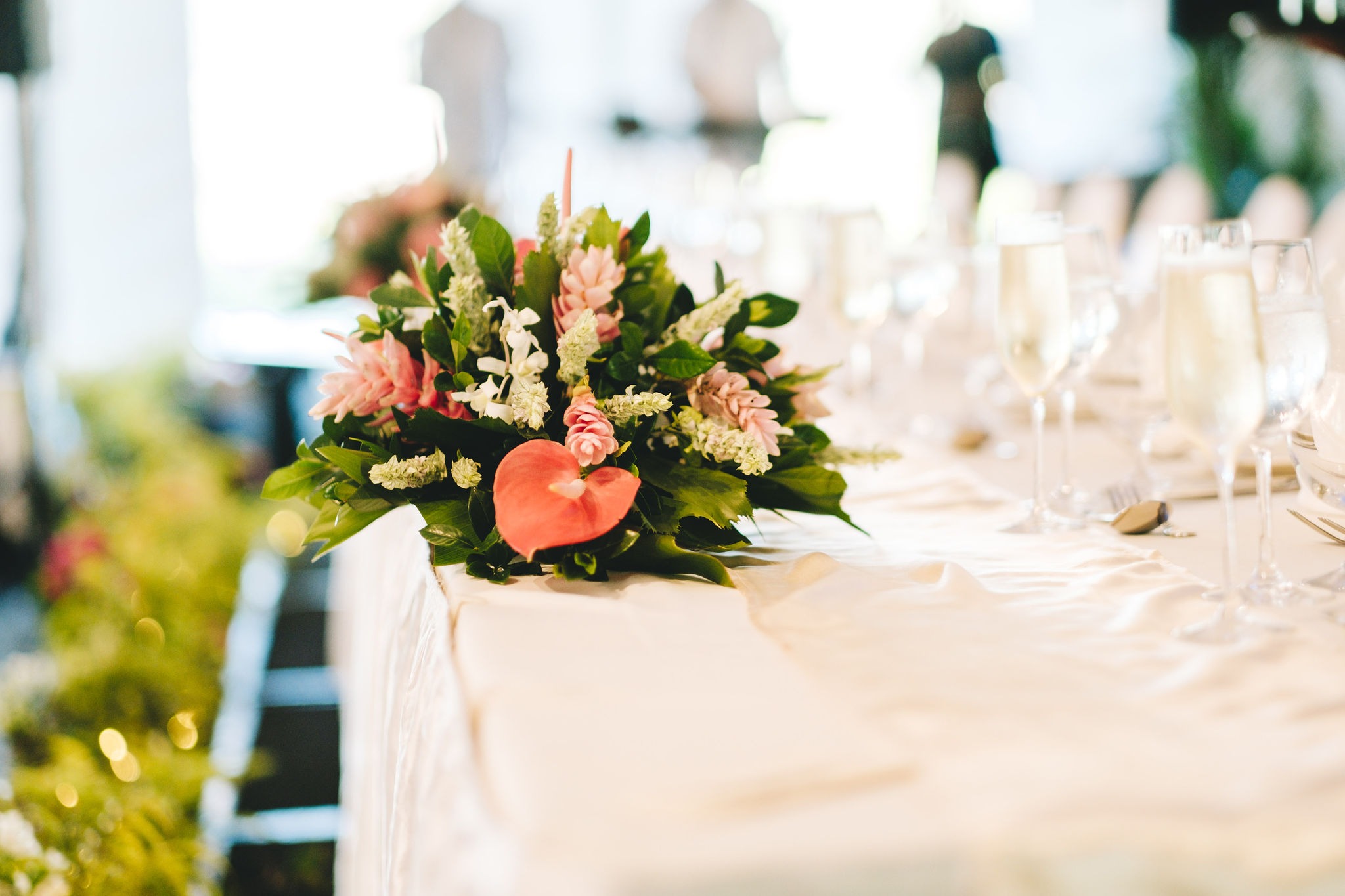 Our ceremony was at the Shangri-La Chapel. The staff at the Shangri-La provided and set up the décor at the ceremony and our flowers and bouquets. Because we had such a beautiful backdrop already, we opted for a softer theme of light pink and white.