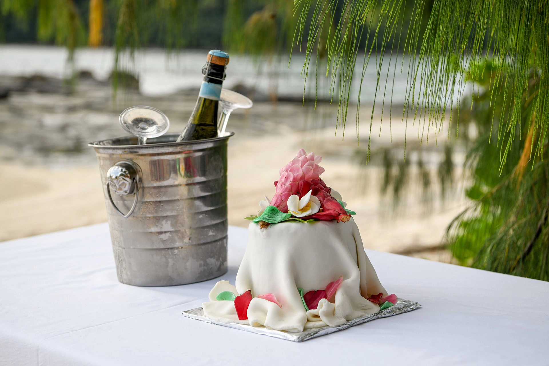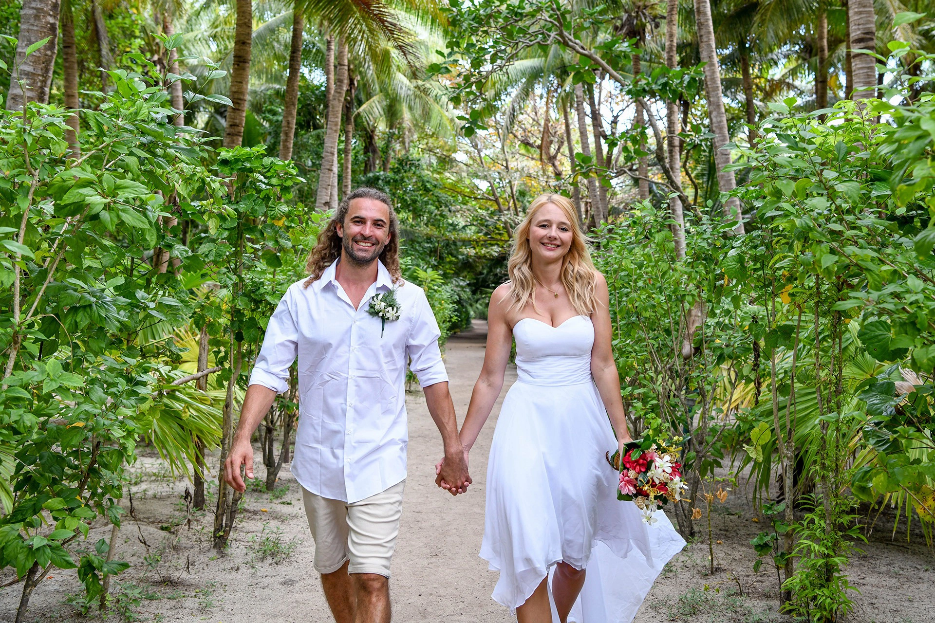 Bouquet, boutonniere and decorations were organized by the resort. So it was a surprise package for us, but it 100% met our expectations. We picked the flower for the bridal hairstyle on the island that day itself.