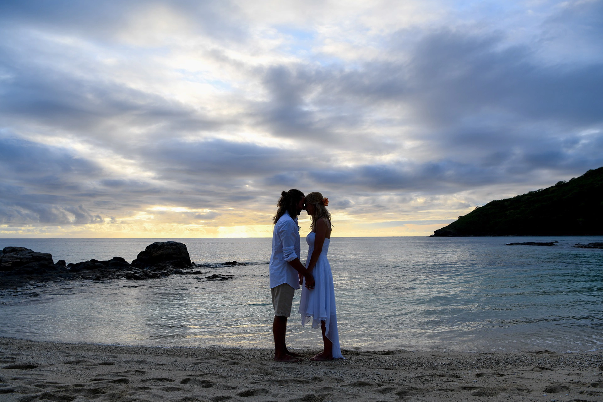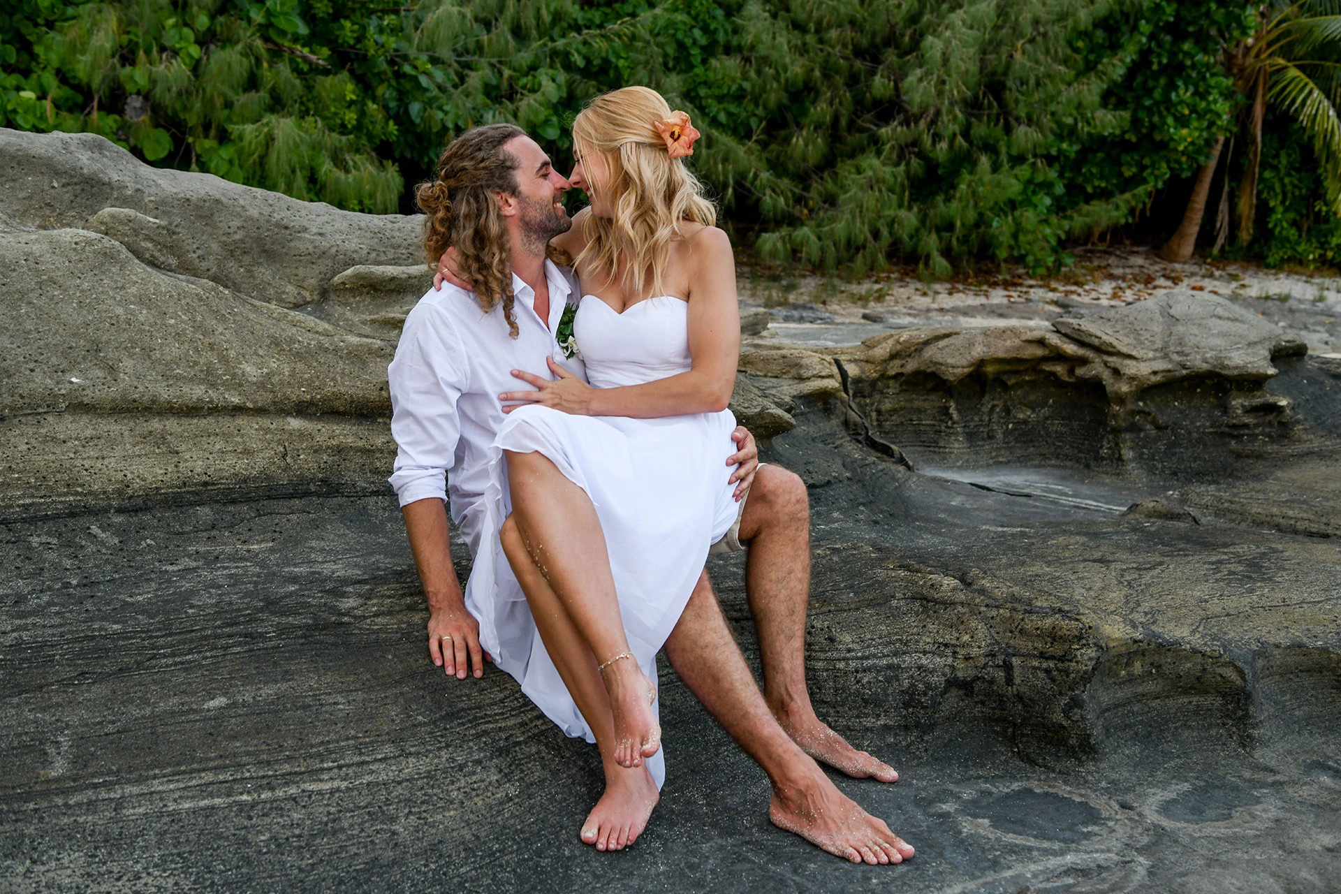 We like it simple and wanted to stay natural and ourselves. I did my hair and make-up myself, using the most necessary tools that I had in my backpack for the day. We practiced the hairstyle at home so my husband was able to help me with a few steps. We brought my dress with us from Germany. We packed well and made sure it was waterproof in our backpacks. We wanted light clothing that fits the location; to support this natural light beach look, we went without shoes and enjoyed the feeling of the sand under our feet.