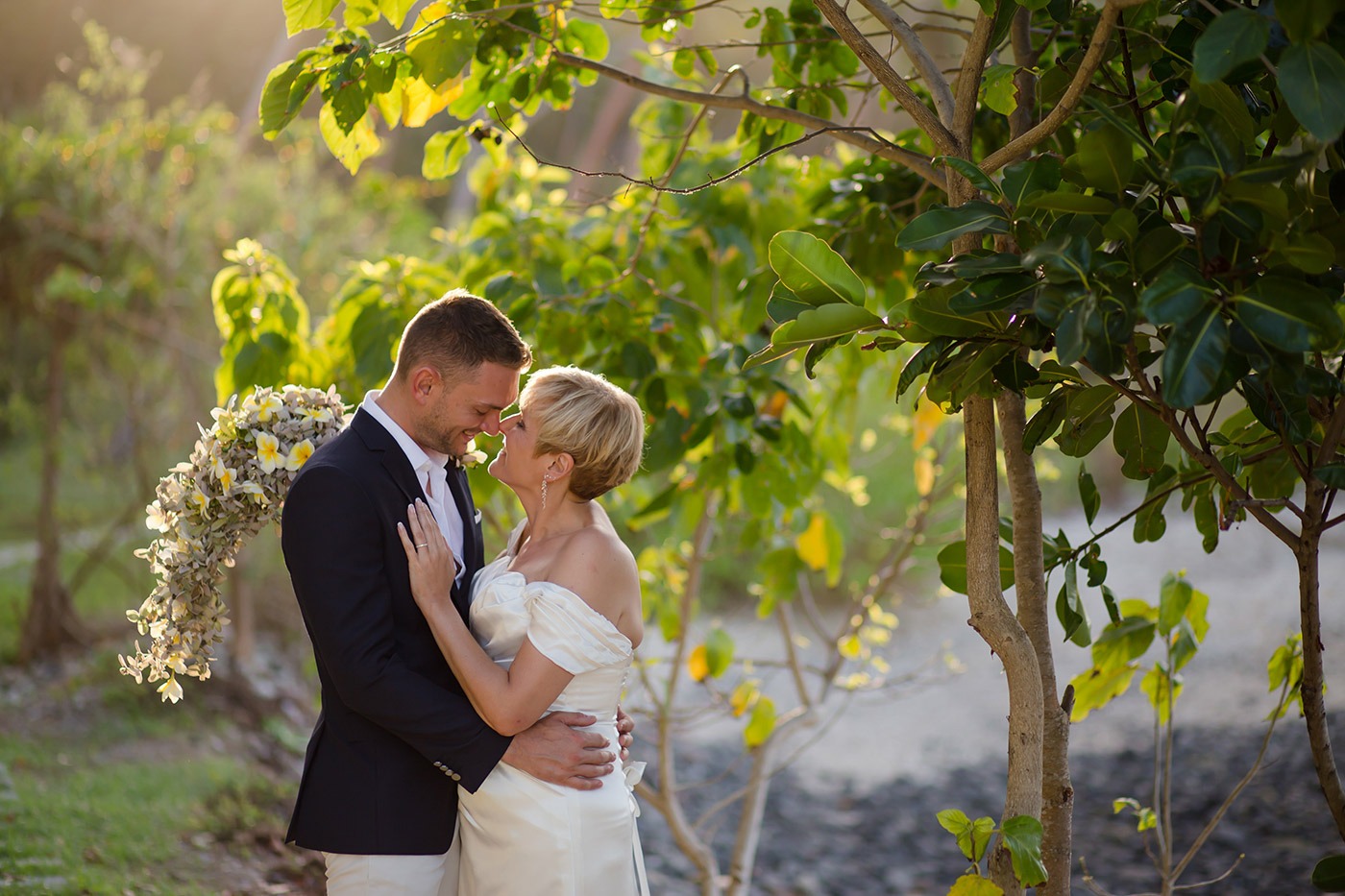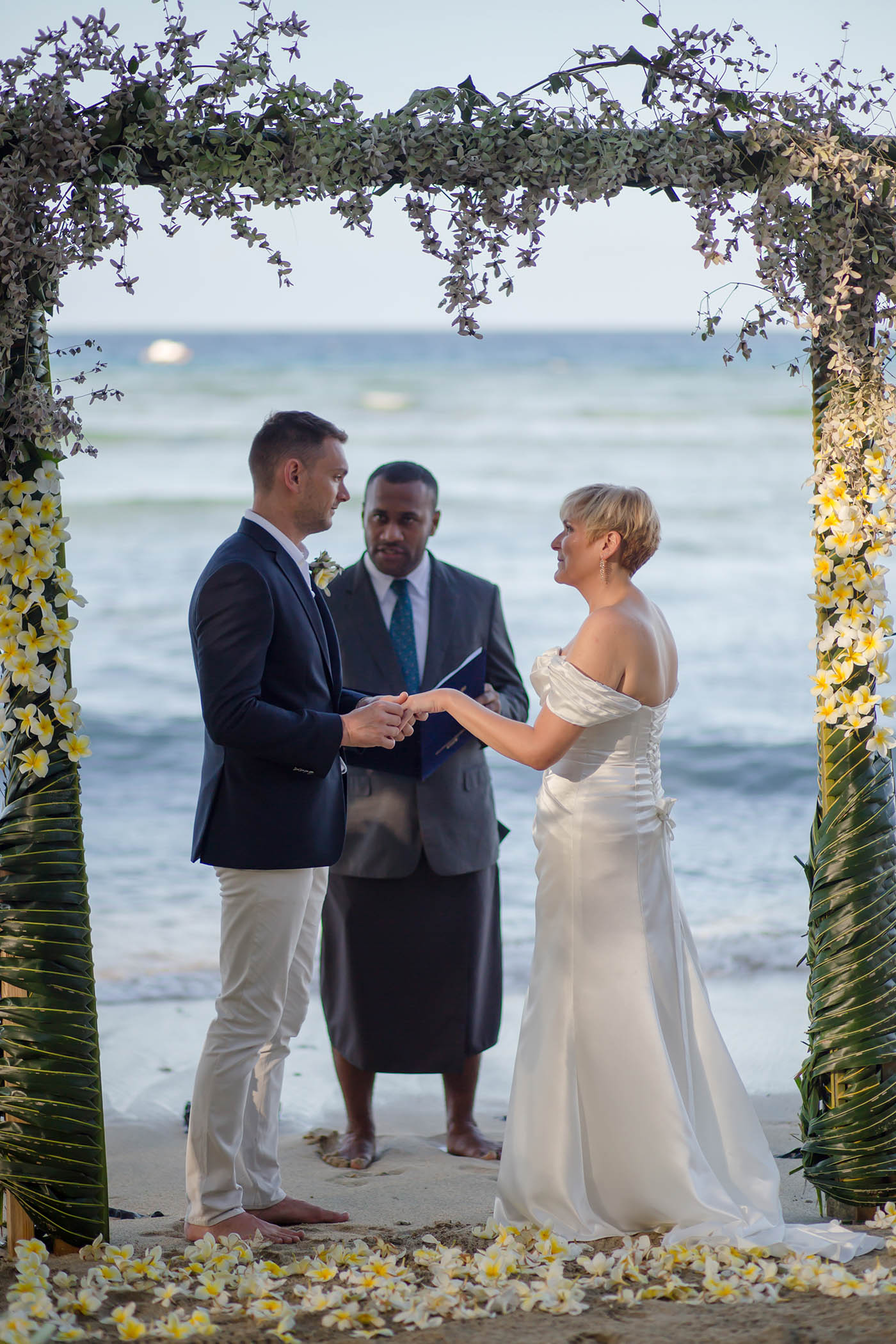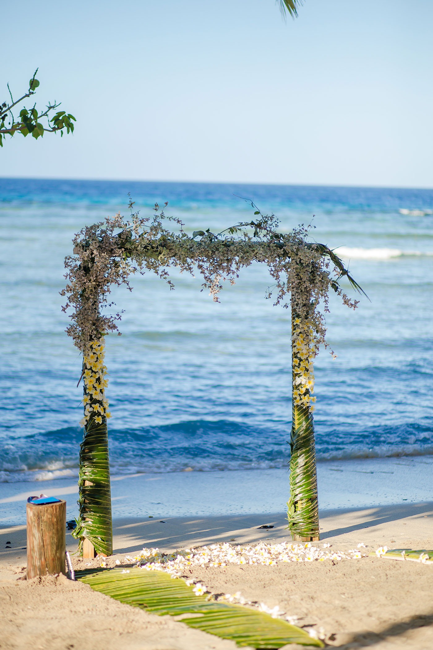 The resort did all of our flowers. I asked for simple white tear drop style bouquet and left the rest to them. They brought in the most beautiful white frangipani bouquet with delicate green foliage and Wes had a matching button hole. The arch on the beach was decorated with palm leaves and the same frangipani and just looked magical. They even made an aisle of palm leaves and scattered more flowers on the floor and around a champagne bucket to the side of the arch. We left the details to them and couldn’t have asked for more.