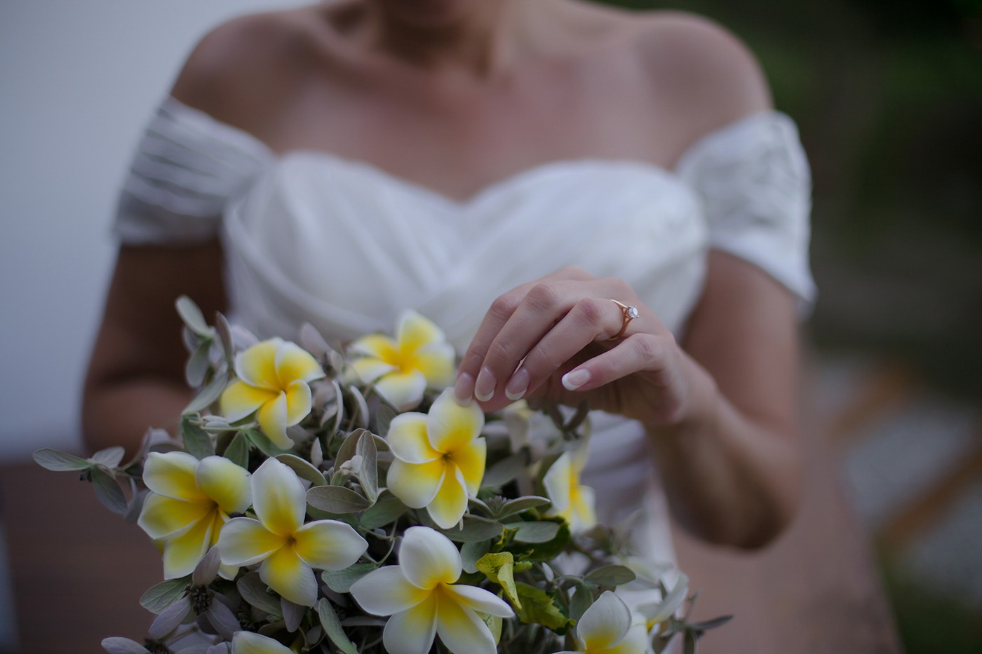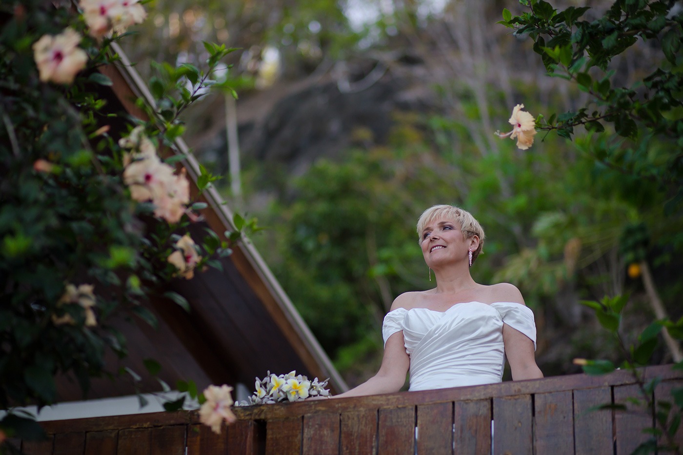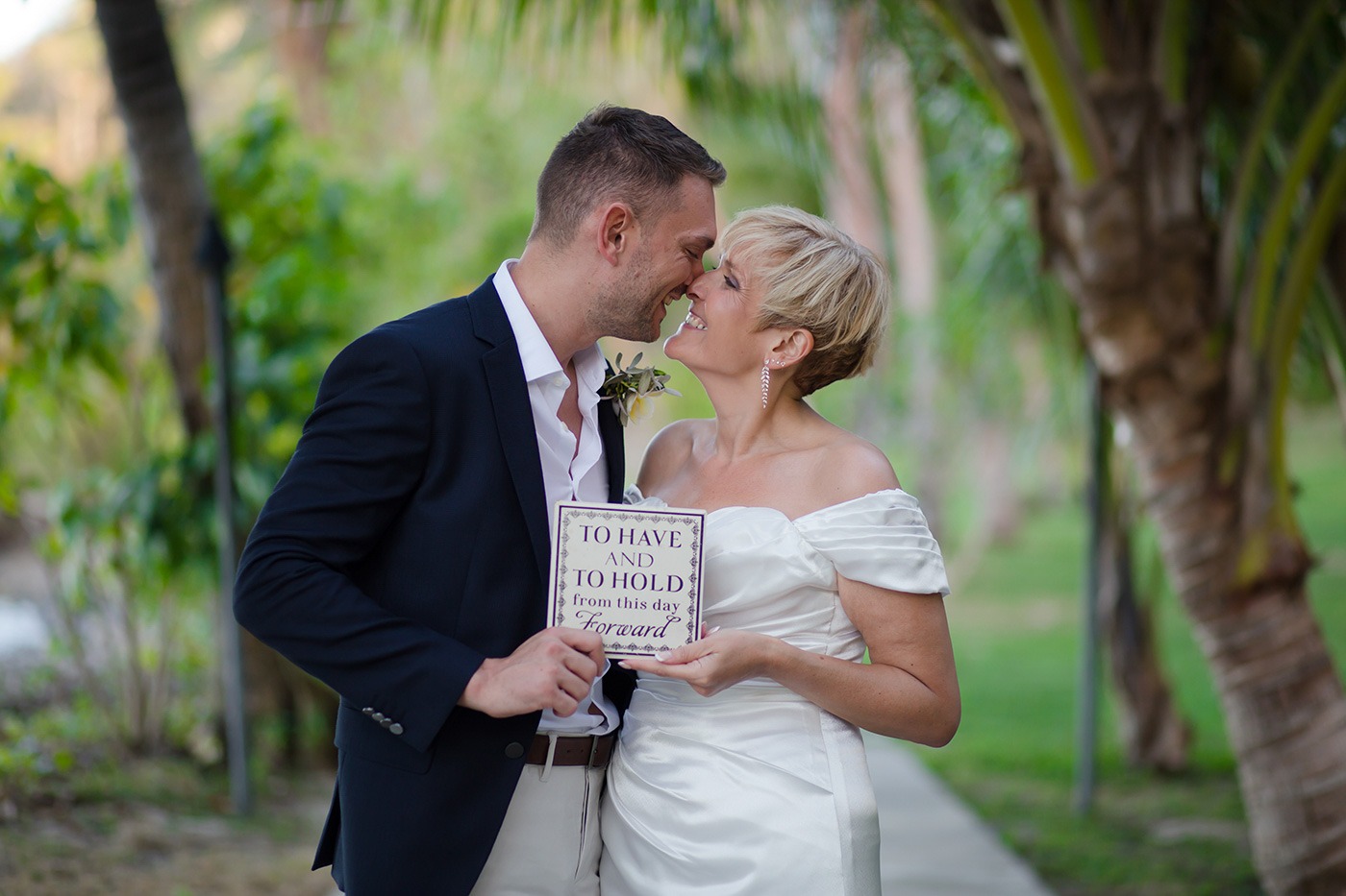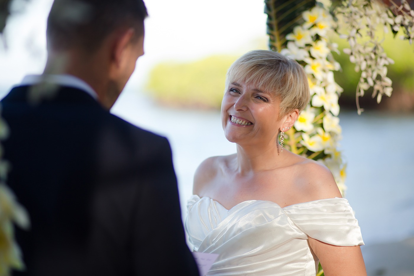 The resort did all of our flowers. I asked for simple white tear drop style bouquet and left the rest to them. They brought in the most beautiful white frangipani bouquet with delicate green foliage and Wes had a matching button hole. The arch on the beach was decorated with palm leaves and the same frangipani and just looked magical. They even made an aisle of palm leaves and scattered more flowers on the floor and around a champagne bucket to the side of the arch. We left the details to them and couldn’t have asked for more.