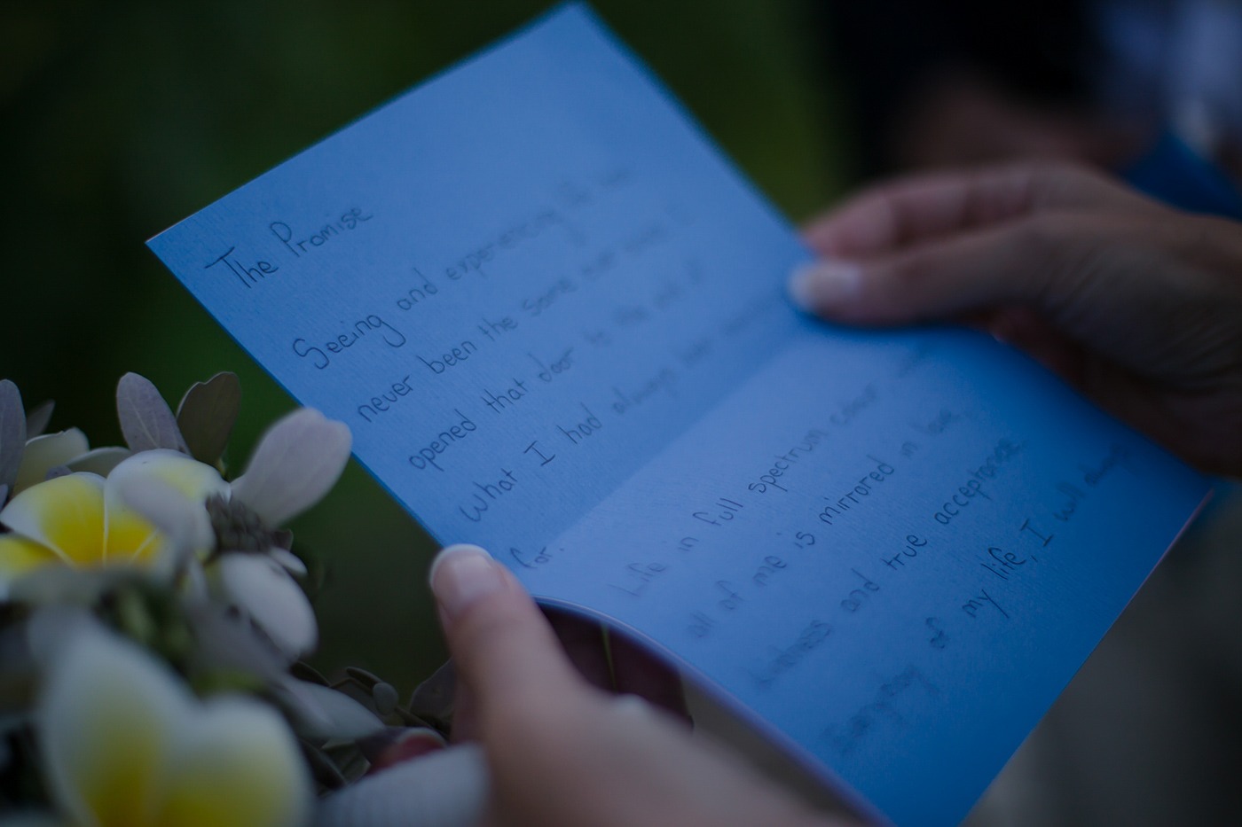We opted to write our own vows. We used a combination of anecdotes about our lives together and promises that we wanted to keep in our marriage. Reading them to each other was very emotional, and even though I had practised mine extensively to try not to cry, we both cried through them! Wes had a further surprise in his though. Snowflakes have been a symbol of our relationship for many years and he wanted to include the reference. So later in the day, he showed me how his vows had been written – the first letter of every line spelled out S-N-O-W-F-L-A-K-E which made me cry again!
