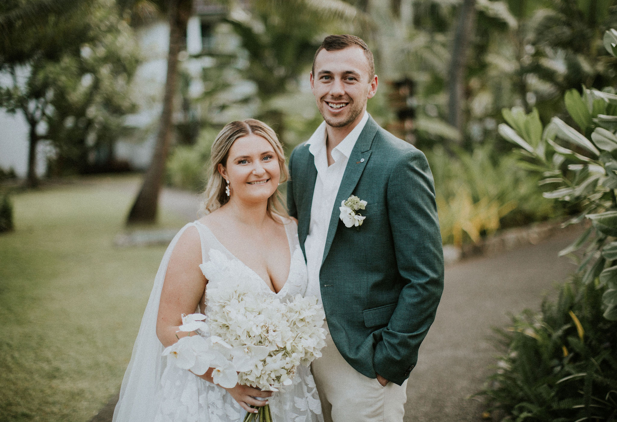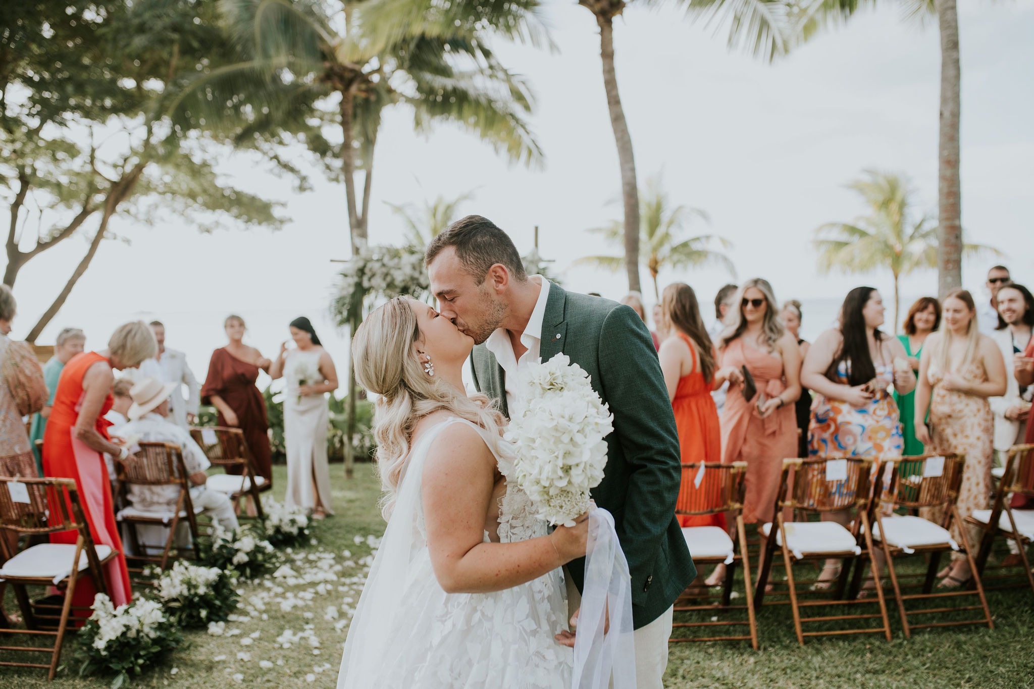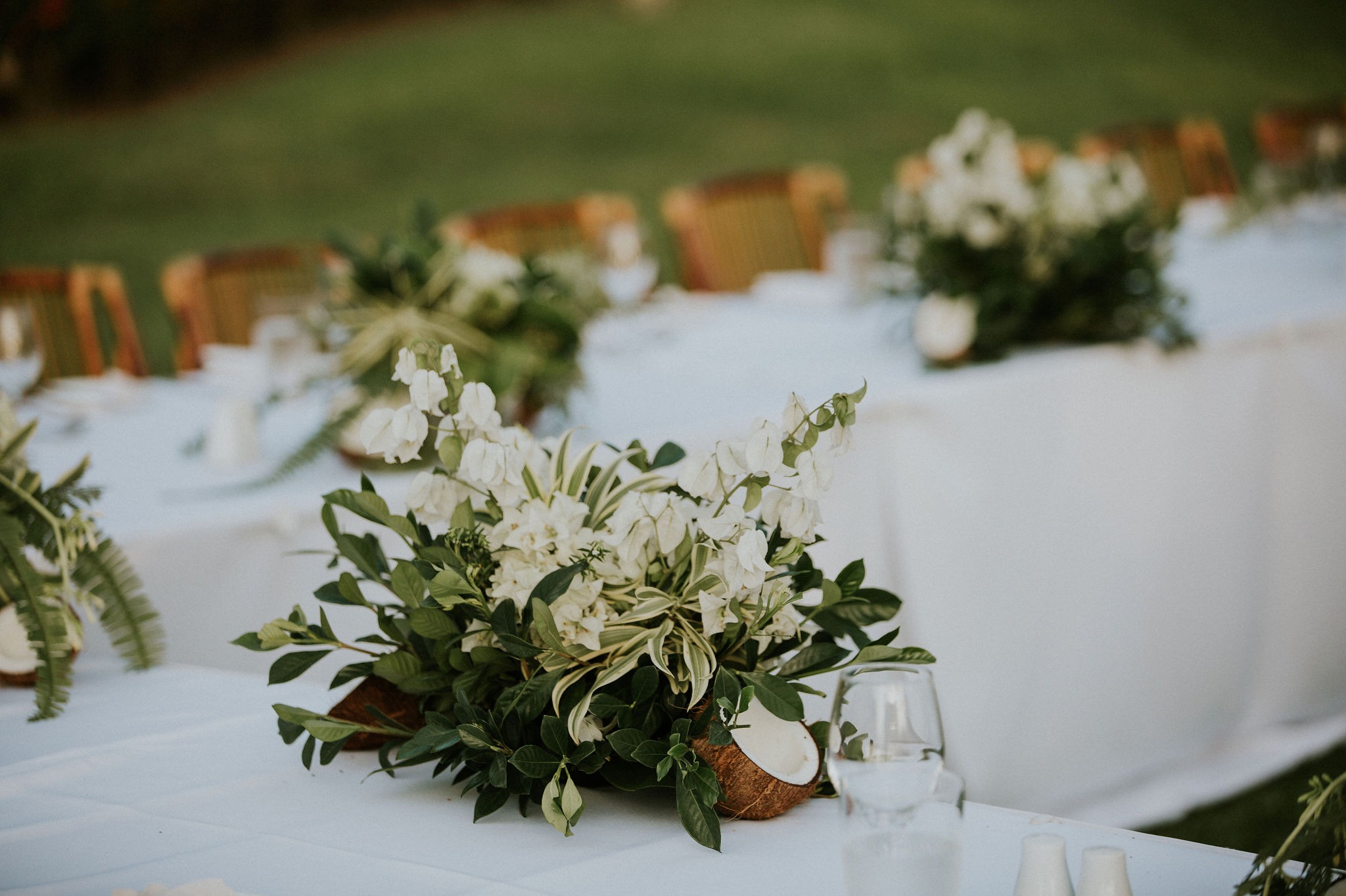 Aka and I developed a unique style over a period of two years (thanks to the pandemic) – the focus was on clean whites, green foliage, and dark timber bamboo. Our theme also had a strong focus on white bougainvillea (as a Fijian substitute for hydrangeas), white orchids and coconuts.