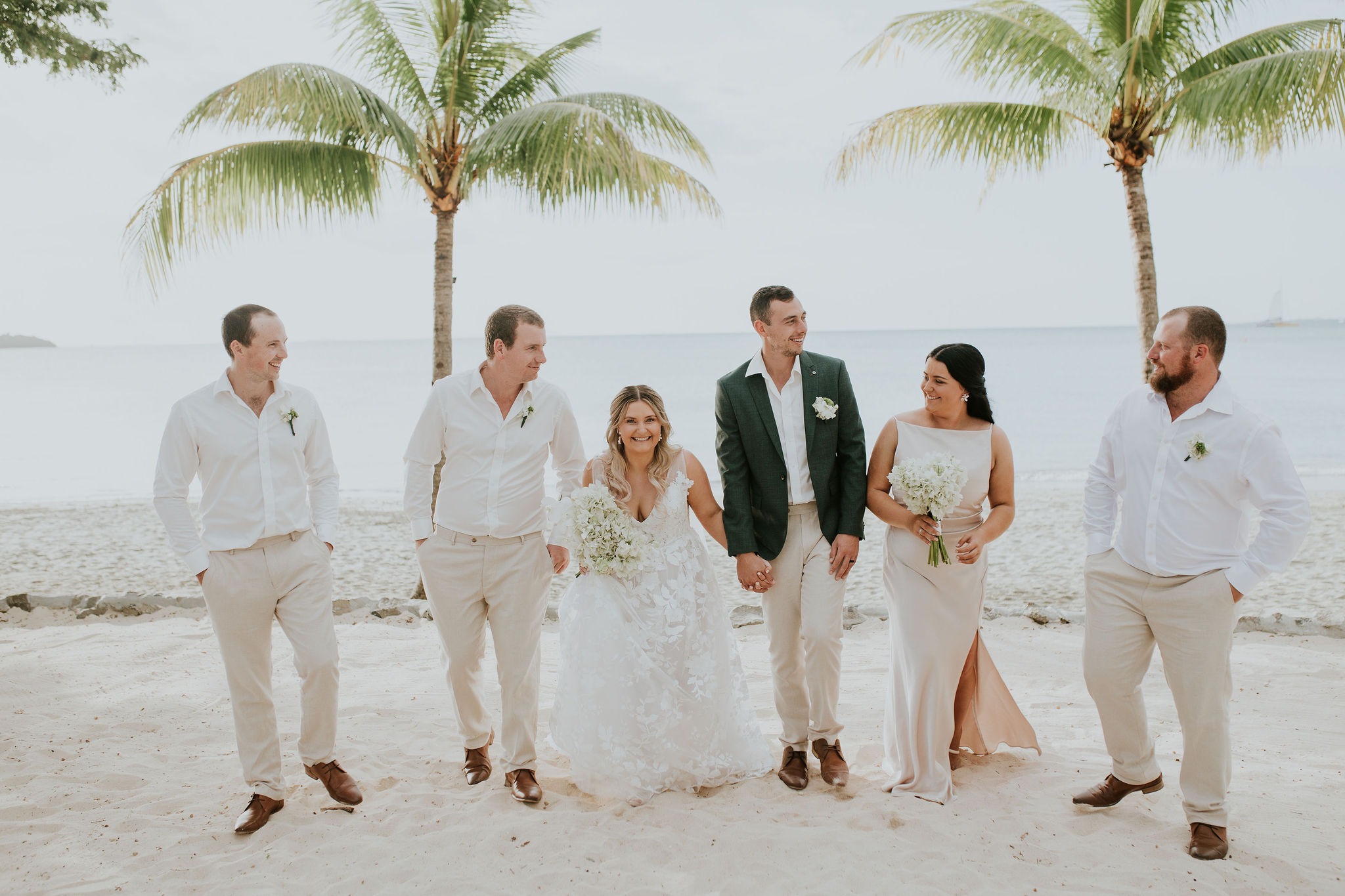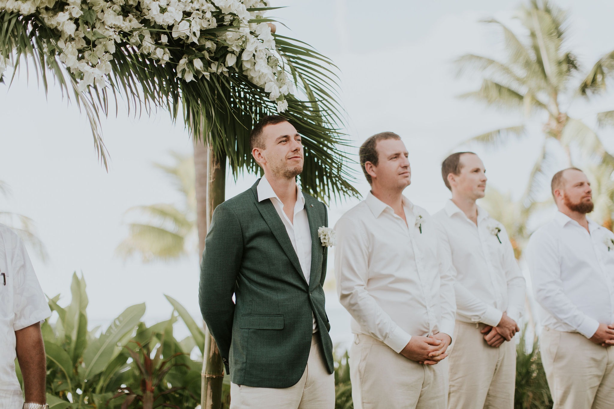 Mat wore a forest green suit jacket from Politix and the groomsmen wore white button up shirts with beige linen pants.