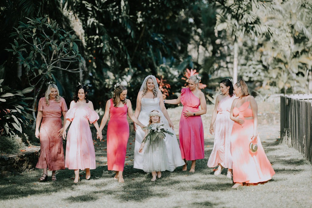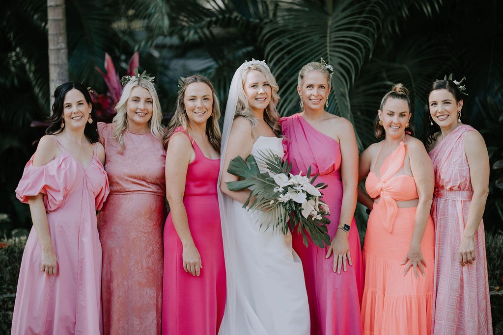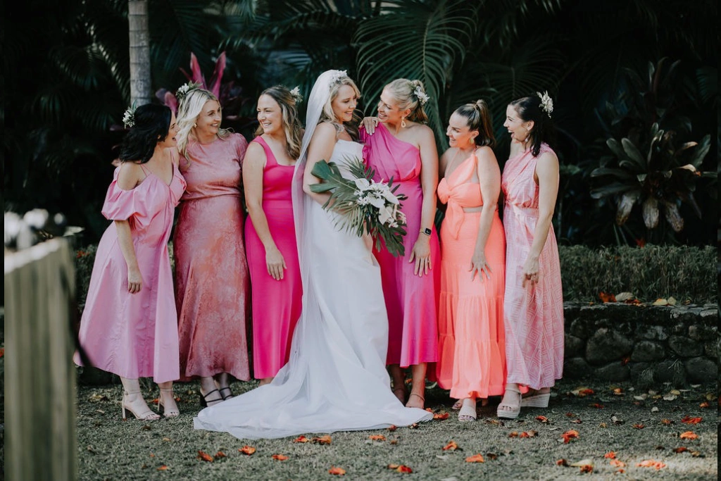 I found my dress at LUV Bridal, which has a huge selection and is open on Sundays—a big plus for my schedule. For my bridesmaids, I wanted them to feel comfortable and have fun, so I simply asked them to wear something pink they loved. The soft pinks looked stunning against all the white and greenery in our setting.