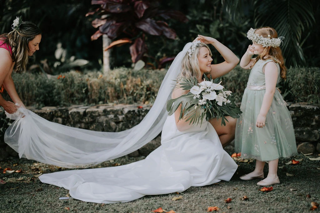 The resort used Bavesi Flowers as the florist, and I worked directly with Sam from Bavesi to arrange additional florals, like bridesmaid hairpieces, a flower girl crown, petals, and floral runners for the reception. Although I didn’t know exactly what to expect, they matched my inspiration photos beautifully, and I couldn’t have been happier with the result.