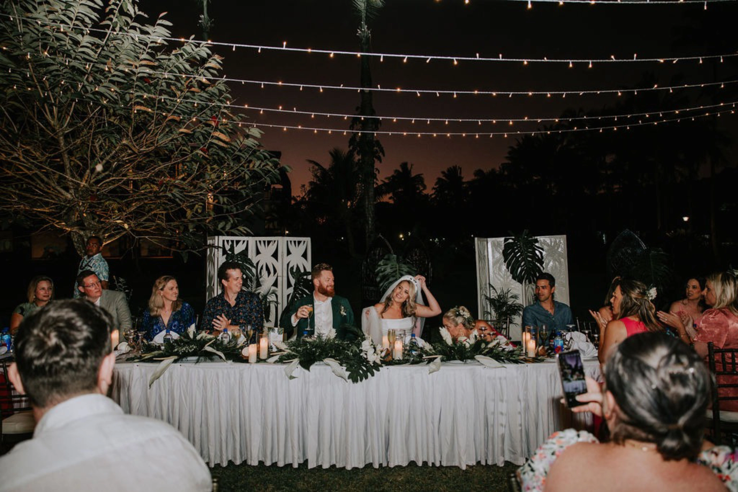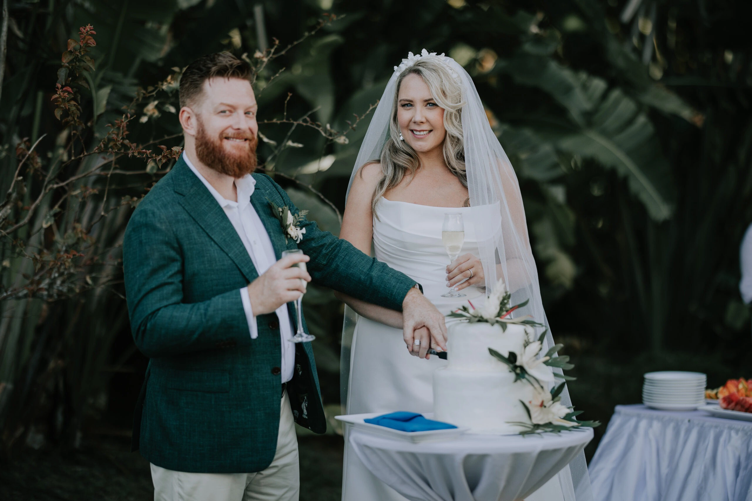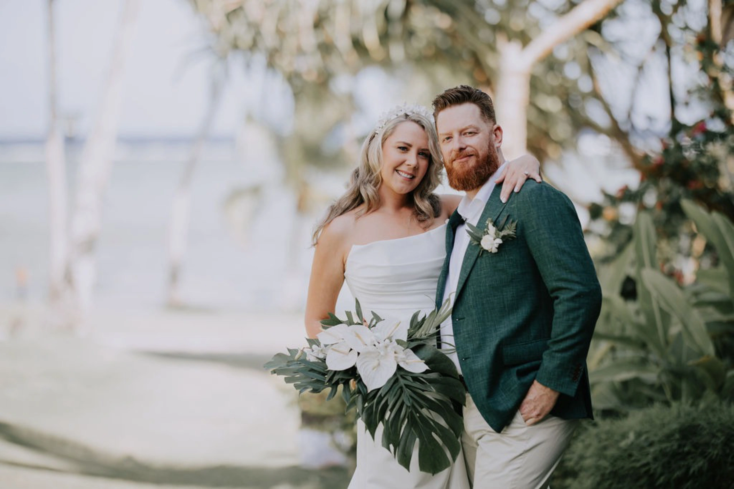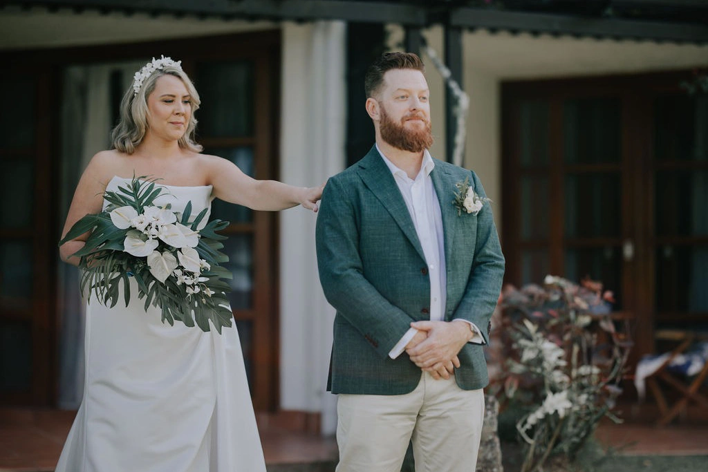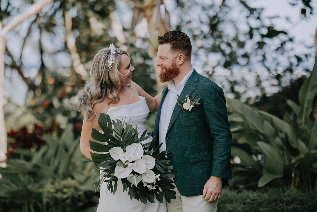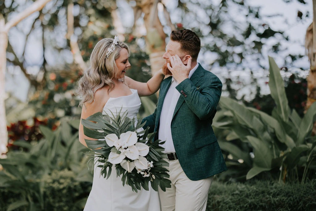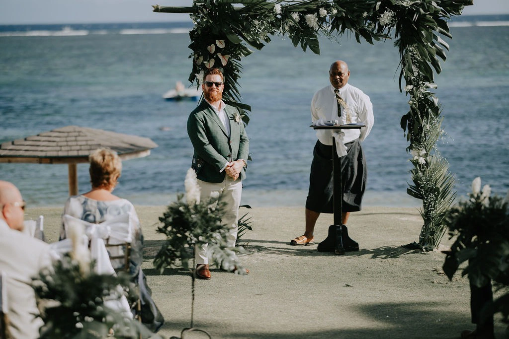 The theme was tropical green and white, with Monstera and palm leaves paired with white flowers. I also had a Fijian Warrior escort me down the aisle, which was a wonderful surprise for our guests.