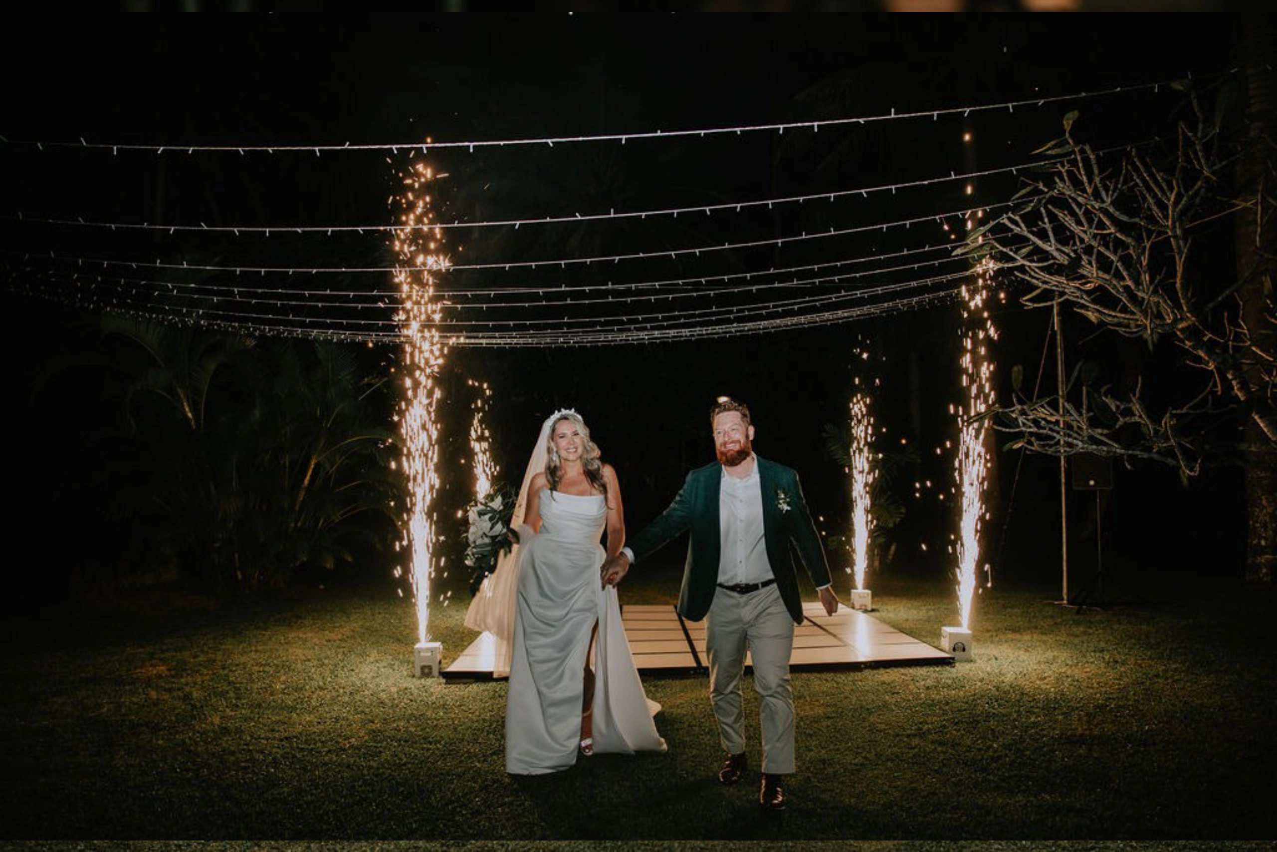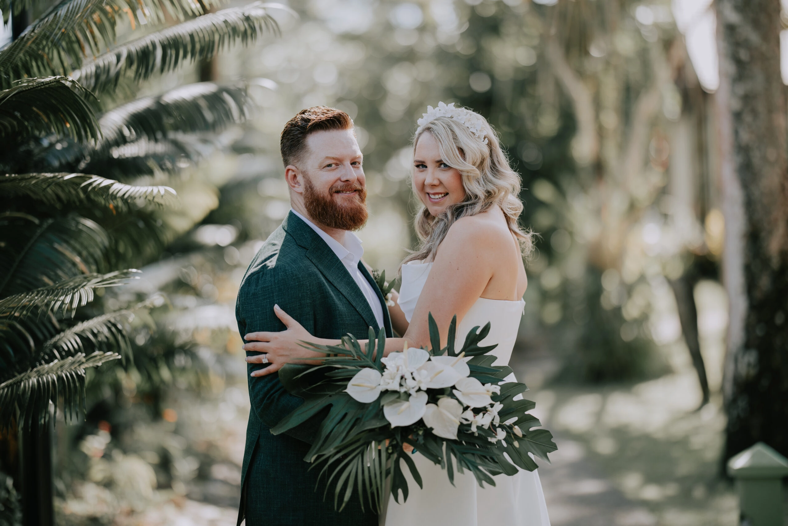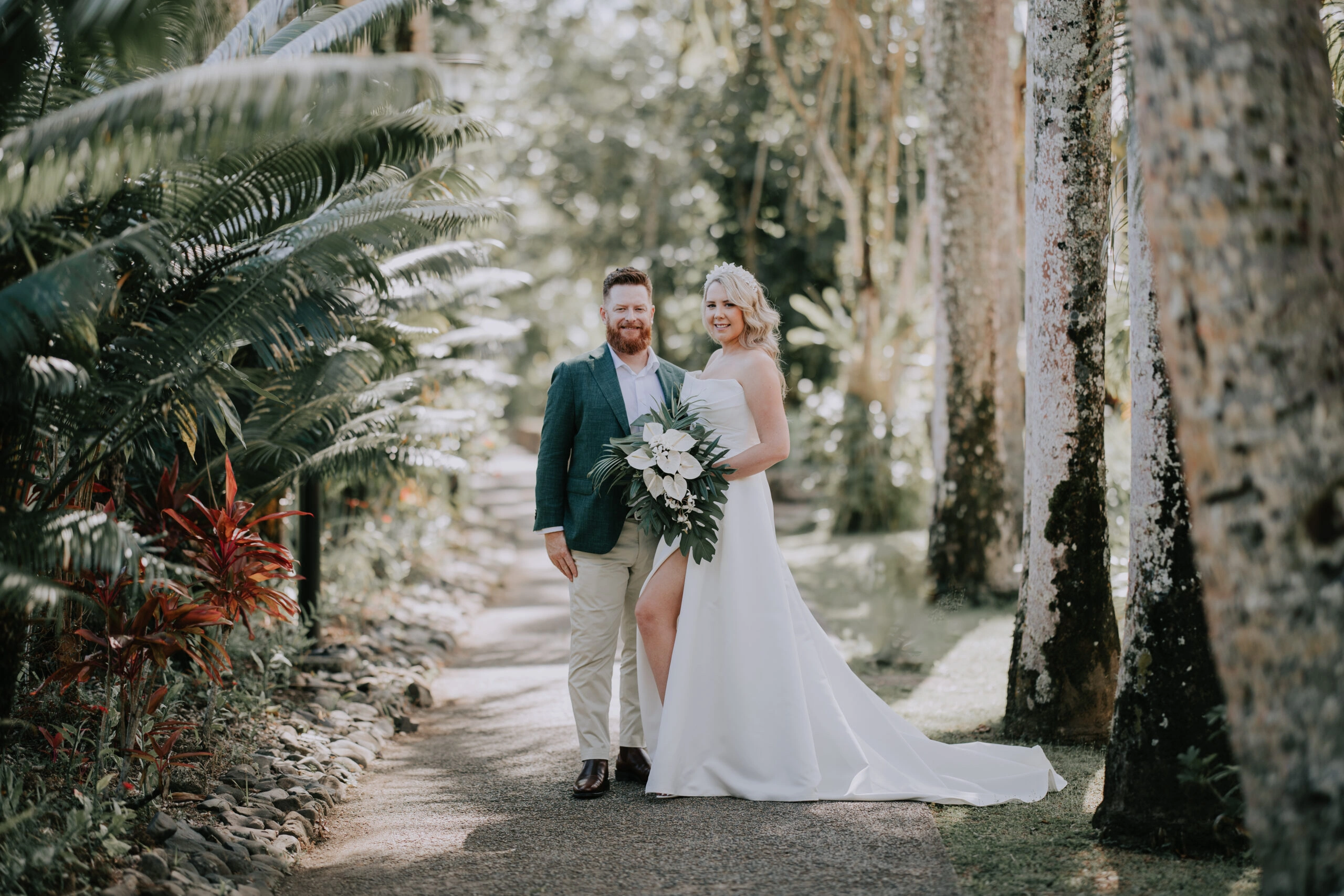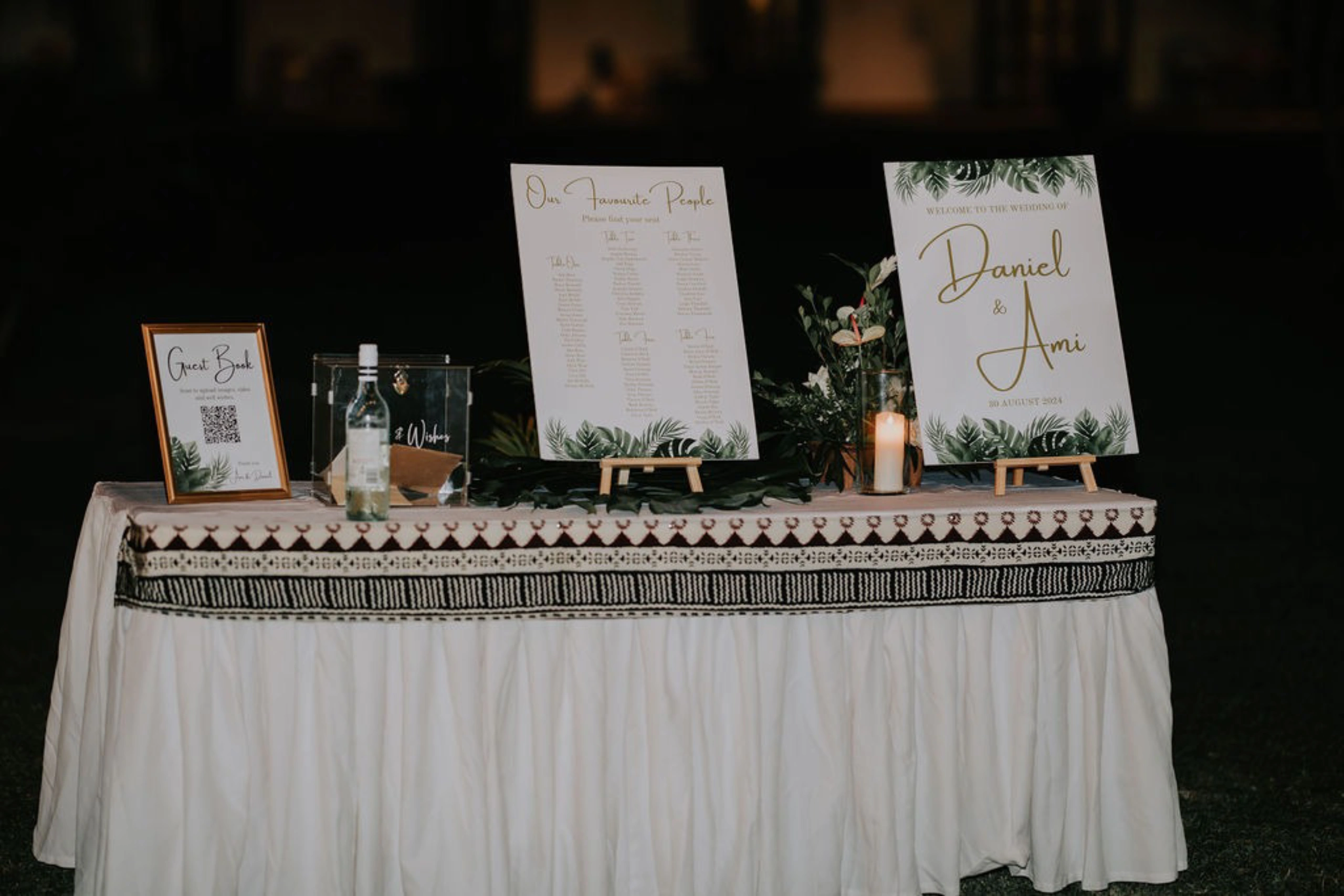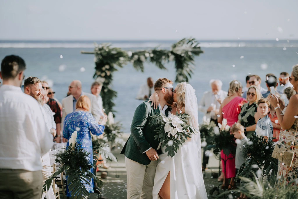 The theme was tropical green and white, with Monstera and palm leaves paired with white flowers. I also had a Fijian Warrior escort me down the aisle, which was a wonderful surprise for our guests.