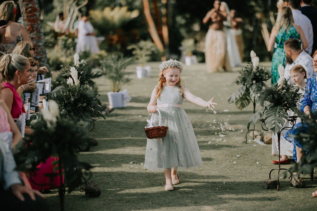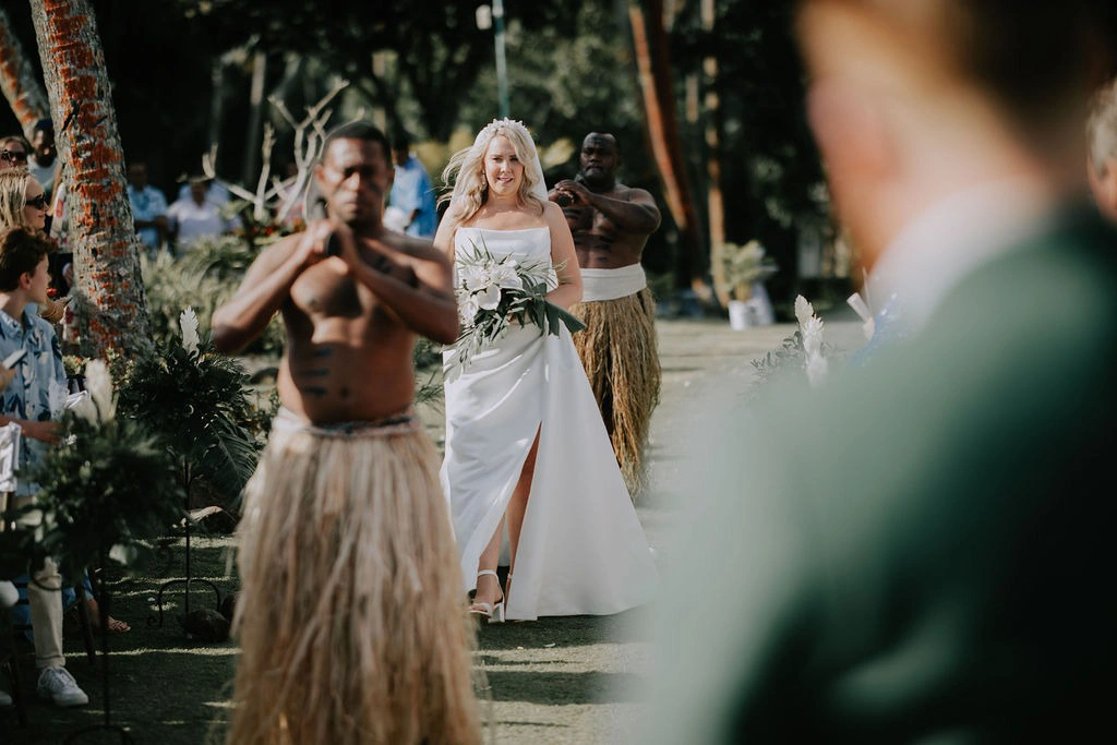 We wanted the ceremony to feel intimate, so our bridesmaids and groomsmen sat with the guests. Three Fijian warriors escorted us down the aisle—one blowing a conch shell to announce our arrival, followed by our flower girl, and a warrior at the front and back.