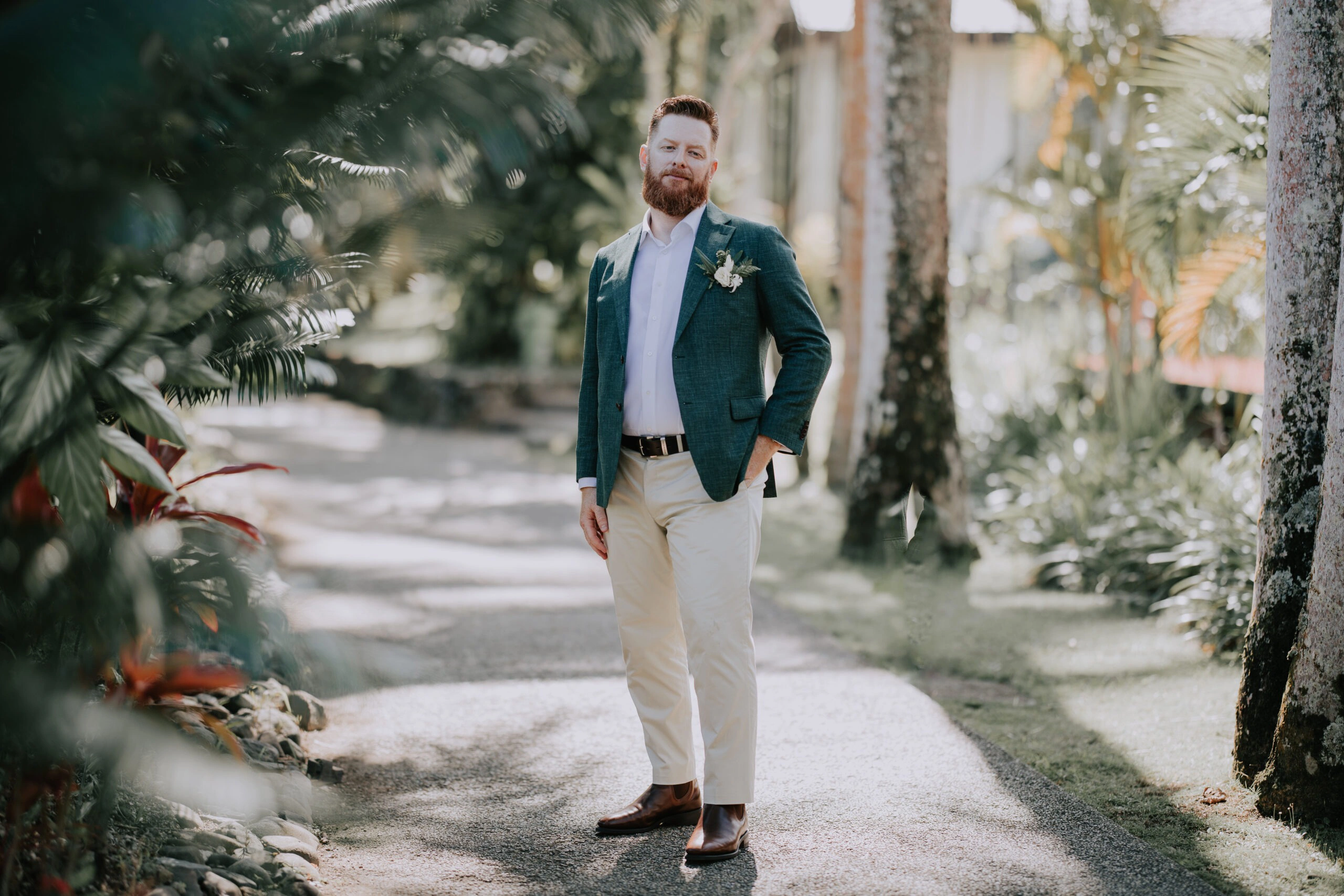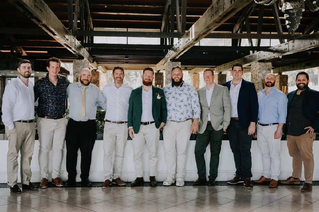 My husband chose a tailored suit from InStitchu—a green linen-blend jacket paired with a white shirt and chino pants. We wanted him to be comfortable, on theme, and able to wear the outfit again. Since he has a big group of friends, we kept things relaxed for the groomsmen too, suggesting a smart-casual dress code with long pants, button-up shirts, and jackets optional. This way, everyone looked great and felt at ease.