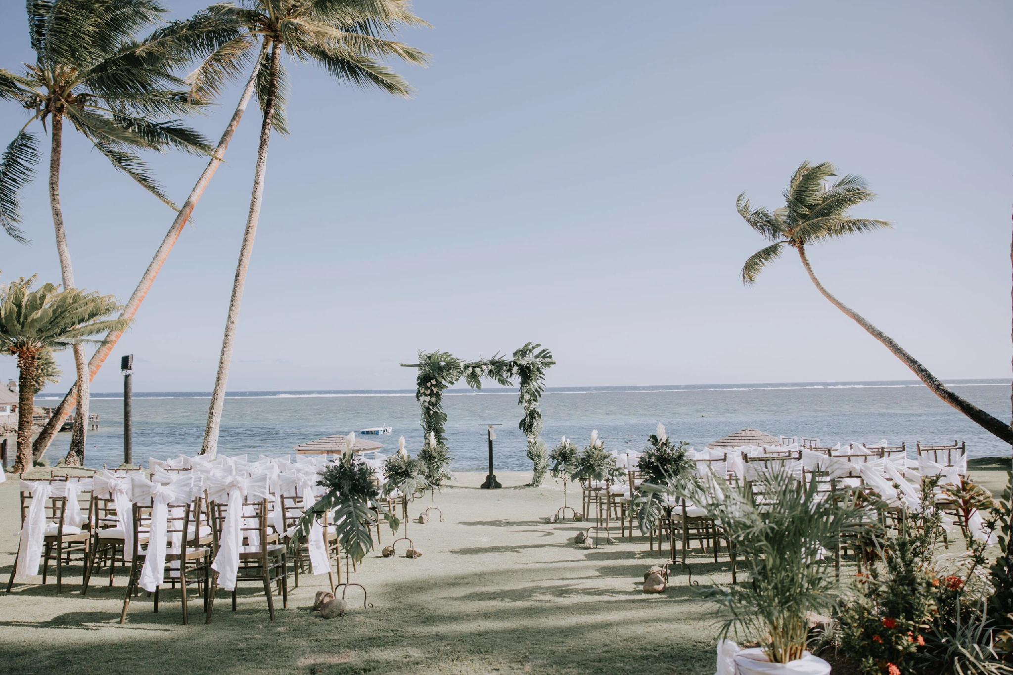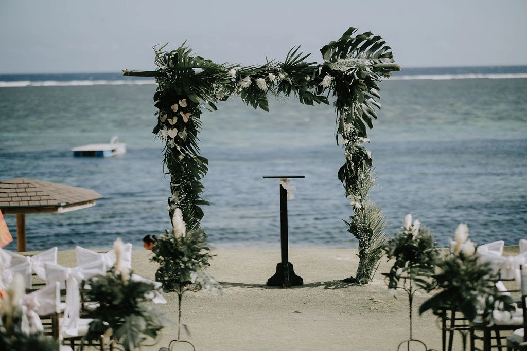 It was a beautiful sunny day (with a bit of wind), so we held the ceremony on the Nadi Lawn overlooking the ocean—the main “dry” ceremony location at the Warwick, and it was perfect. Our wedding package included all the ceremony furniture and florals; we simply shared some inspiration photos for the arch and arrangements.