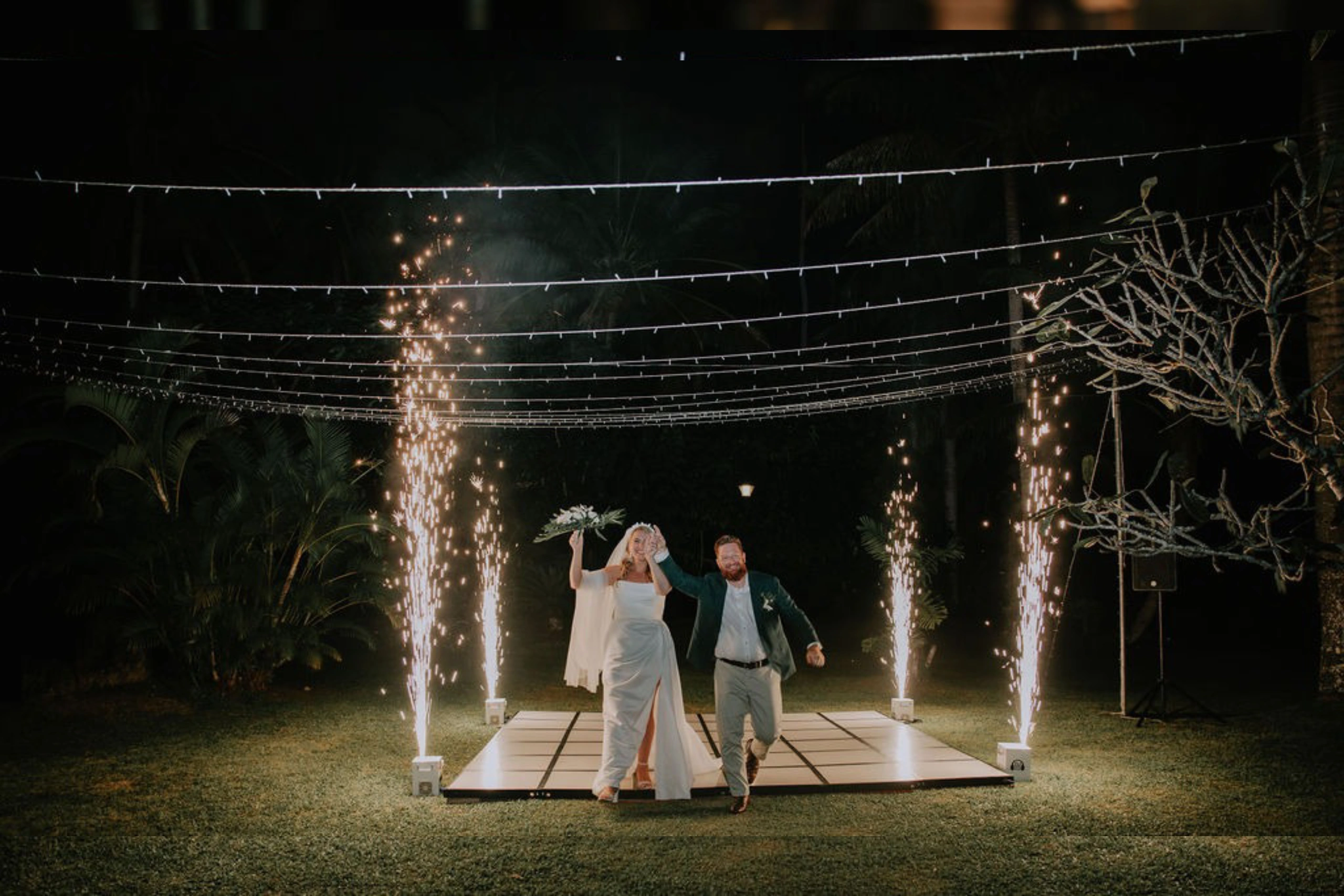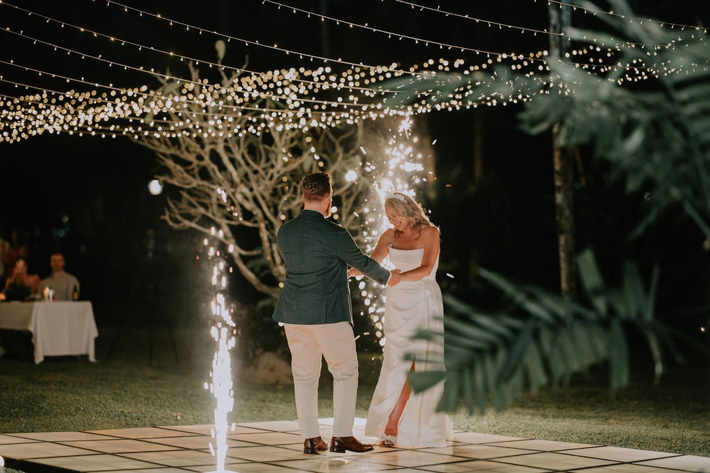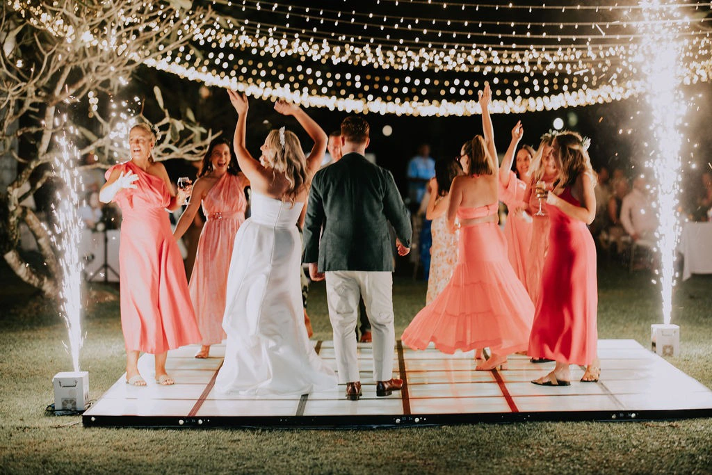 The Warwick provided tables, chairs, and linens, and we coordinated on colors and arrangement. DJ Works supplied the magical fairy light canopy and the light-up dance floor, while Bavesi Flowers created gorgeous greenery and floral runners. We brought over table numbers, name cards, and LED flicker candles (to avoid wind issues). I shared a few visual aids for place settings, and the Warwick team took care of the rest. We also repurposed the ceremony florals to style the reception, keeping a cohesive look with Monstera and palm leaves, white flowers, coconuts, and candles on white linen tables.
