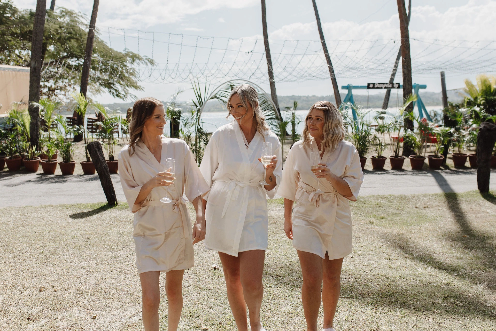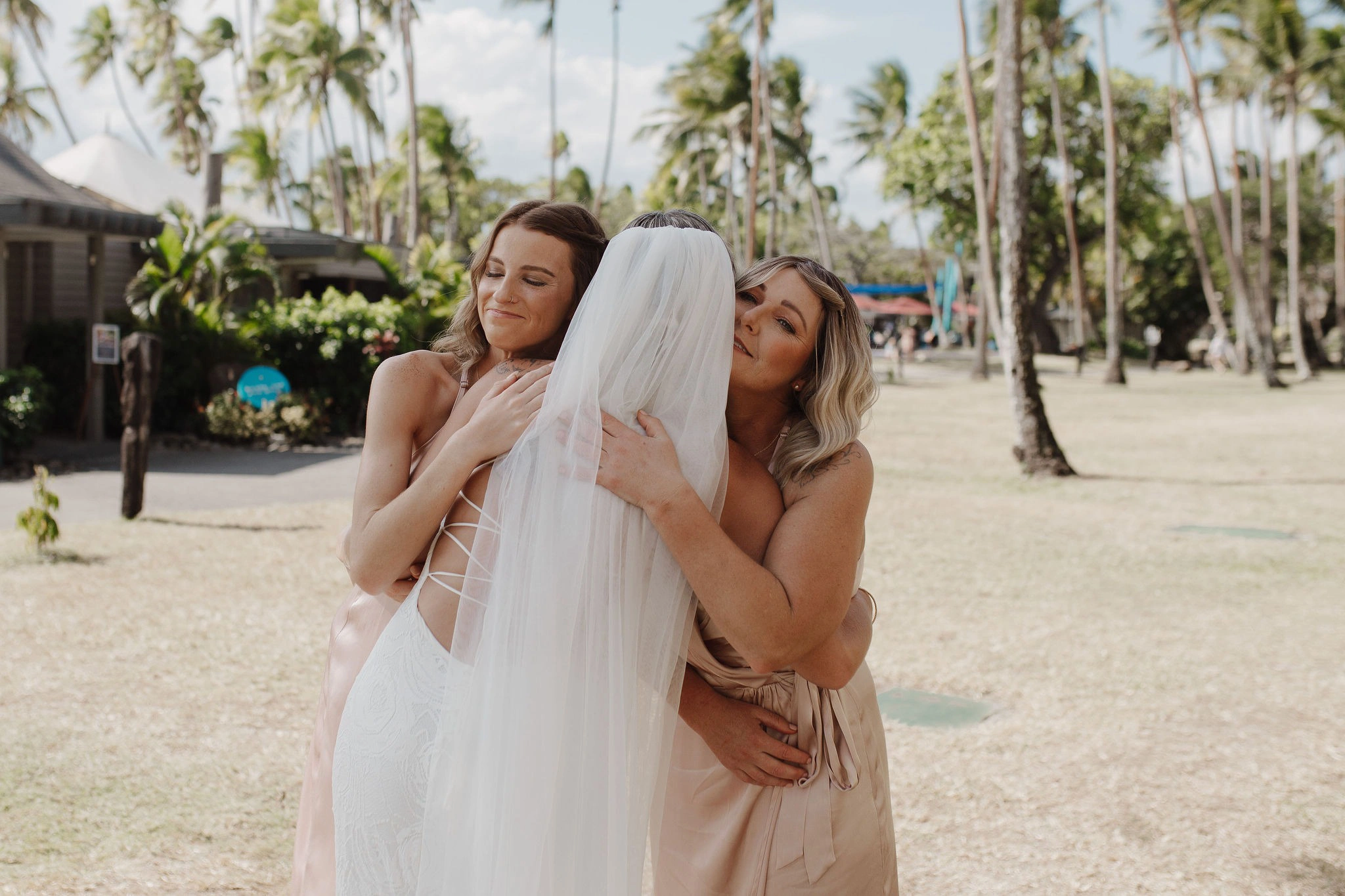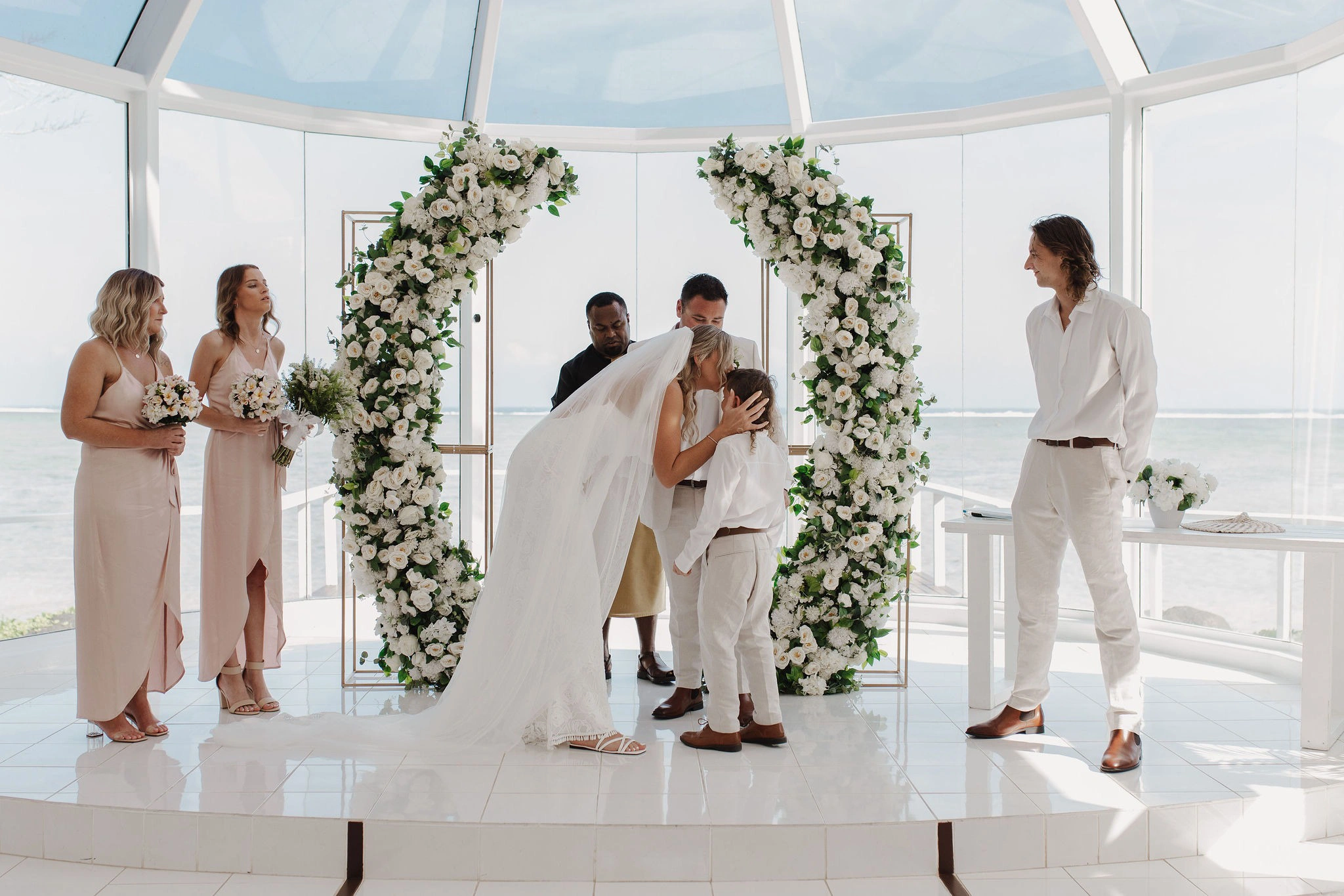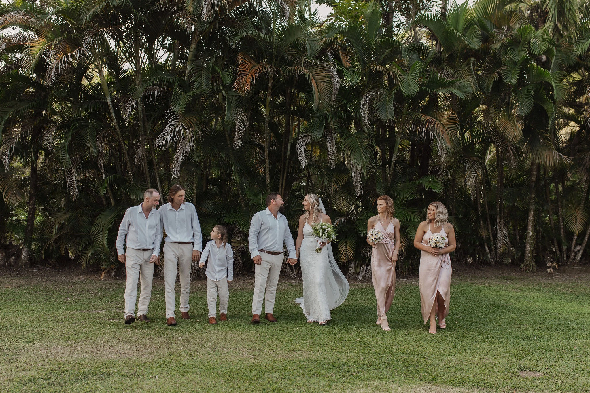 My dress was from Grace Loves Lace Australia. I’ve always loved their style, and it felt perfect for the relaxed, island vibe. The bridesmaids’ dresses were from Evolution Bridesmaids in New Zealand, and we were thrilled with how stunning they looked—the color tones were absolutely gorgeous. The groom’s suit was from Tarocash, a fantastic store in New Zealand, and the only place that had the ideal color I envisioned.