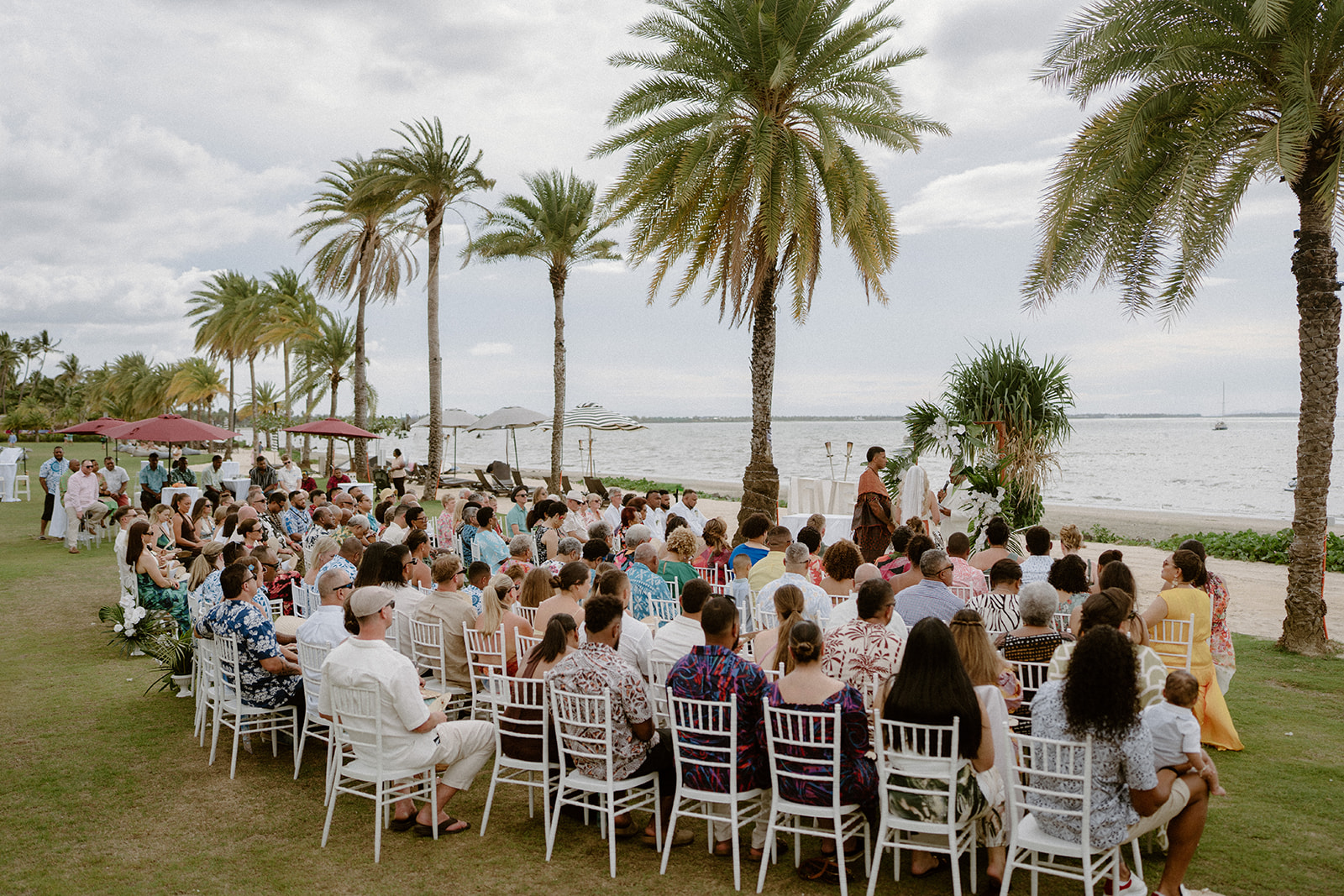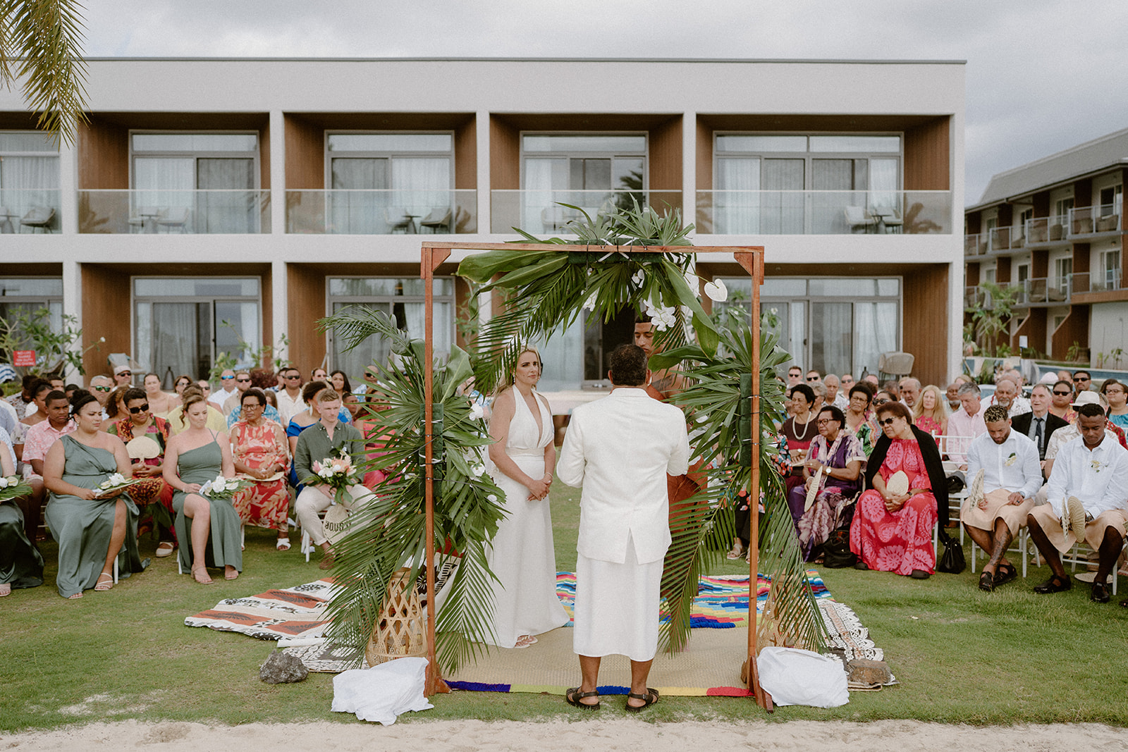 We chose to have our ceremony on the North Lawn at Crowne Plaza Fiji because I’d always dreamed of an outdoor wedding, and this spot felt more private and intimate. We also set up a cocktail area right next to the ceremony so our guests could relax with drinks before the reception began.