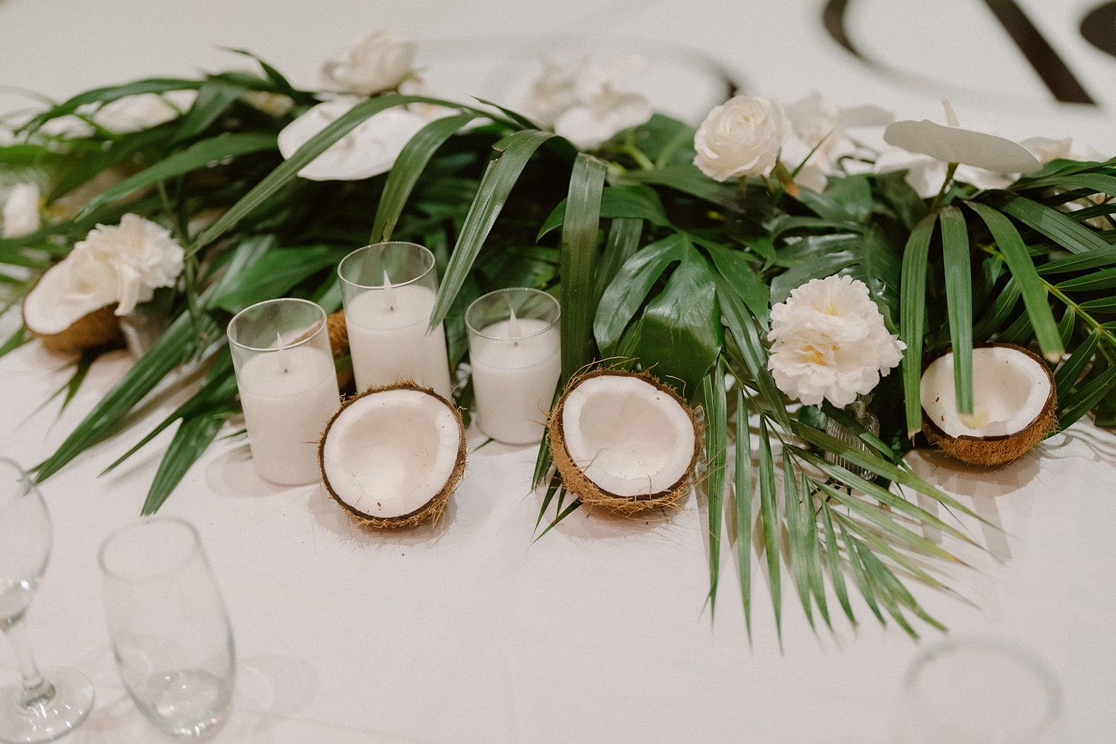 The Wedding Shop Fiji carried the décor theme from the ceremony and cocktail area through to the reception, keeping the refined garden-beach vibe consistent. We loved that it all felt cohesive, elegant, and tropical. For food, we chose a buffet that mixed international dishes with traditional Fijian cuisine, and we were able to select all the items ourselves, which was a really fun part of the planning.