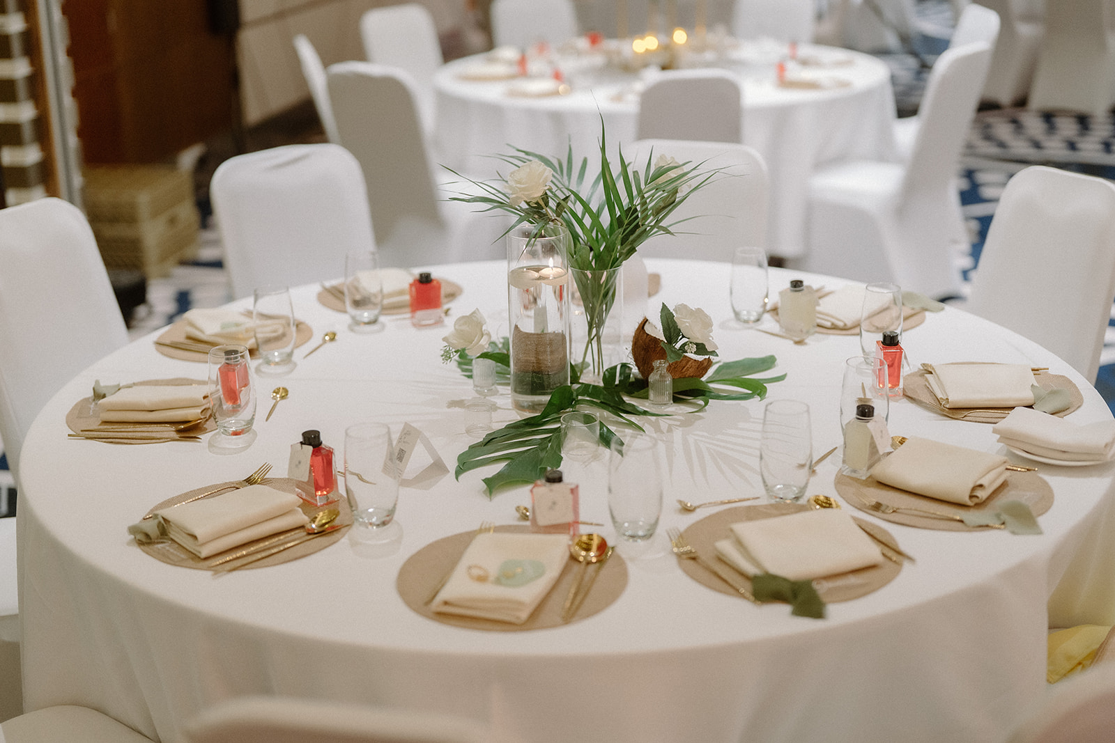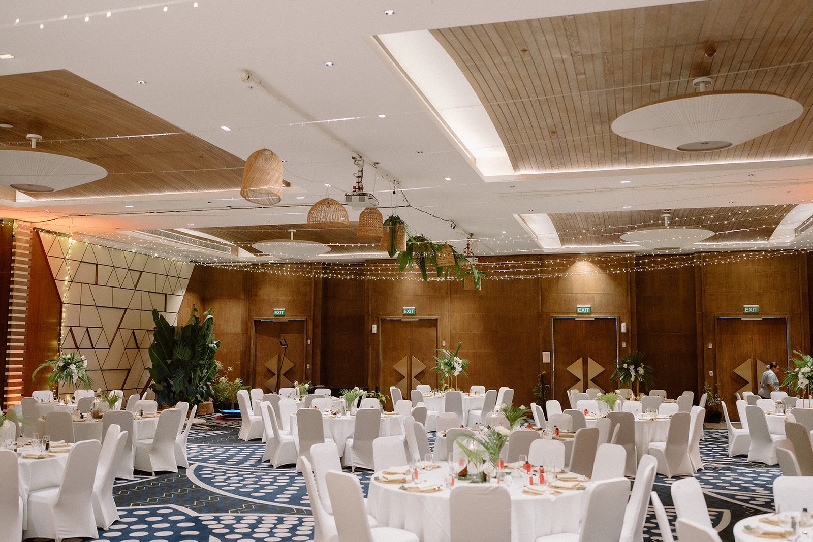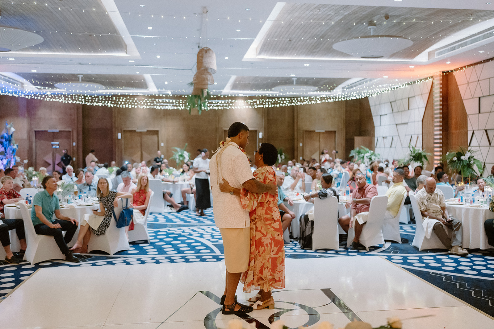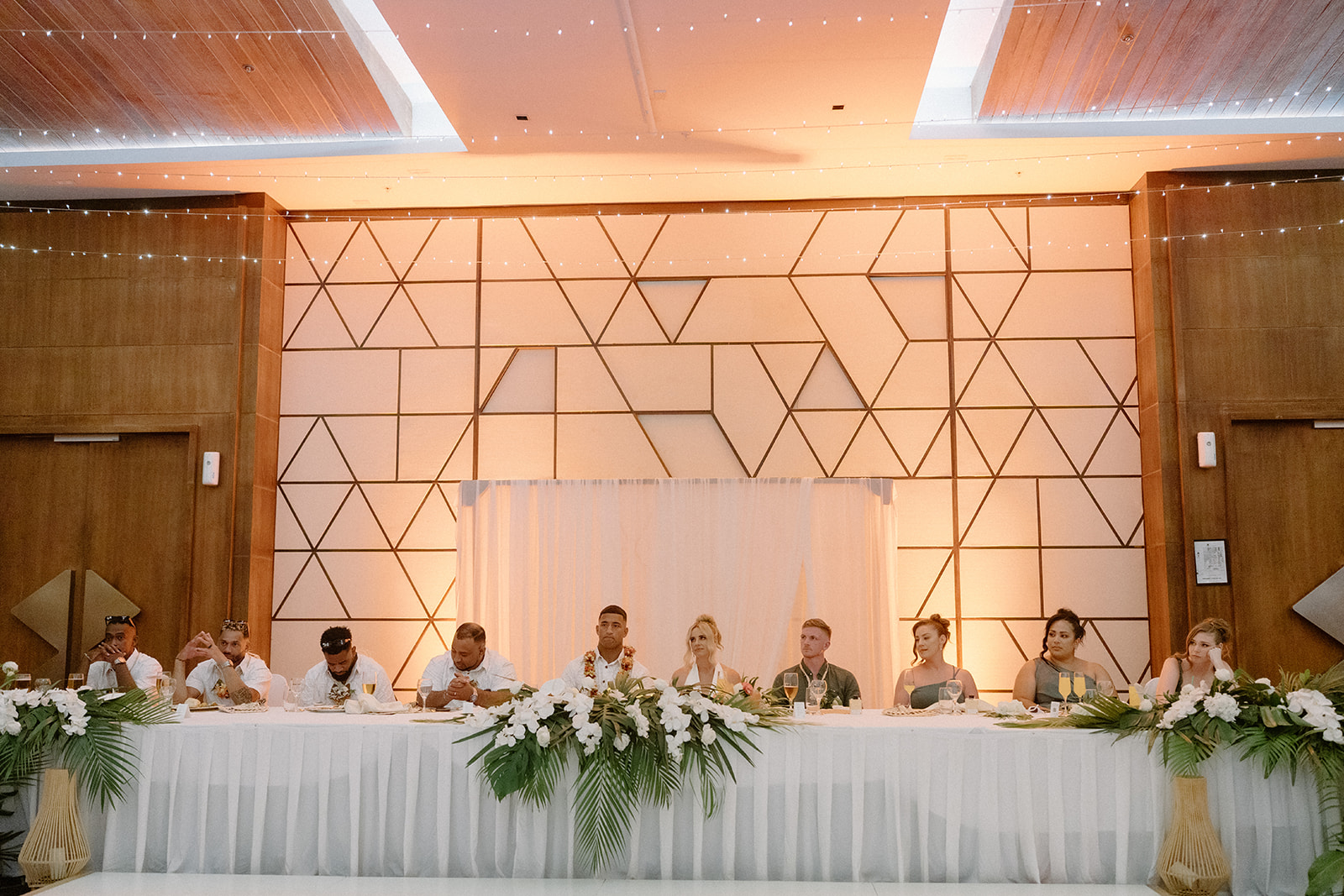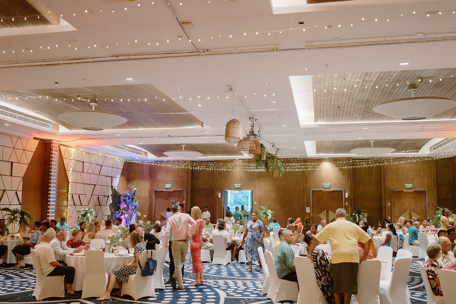 Our reception was held in the ballroom at Crowne Plaza Fiji. Originally, we had hoped for an outdoor reception, but the weather had other plans, so we went with our backup — and it turned out perfectly.