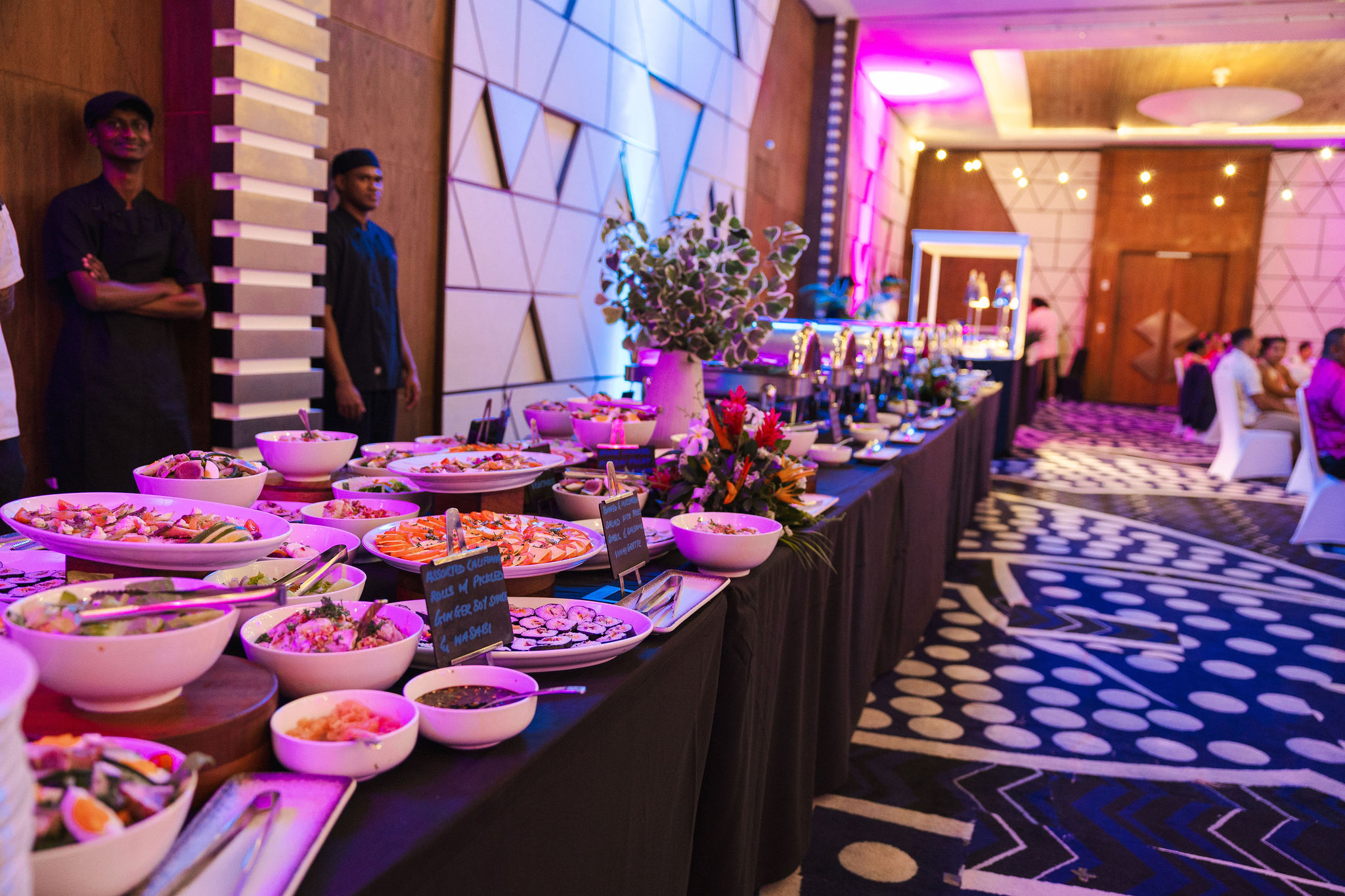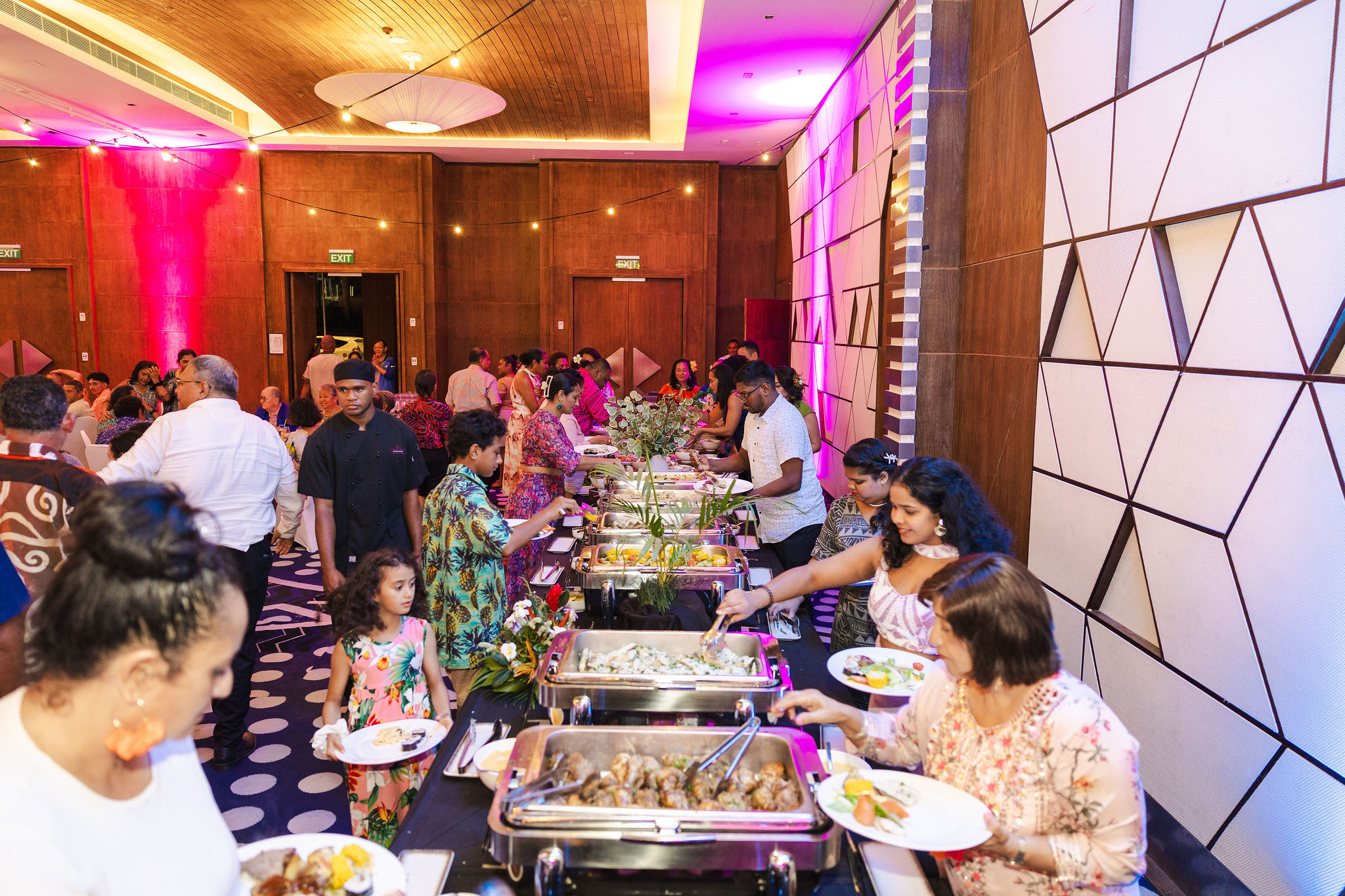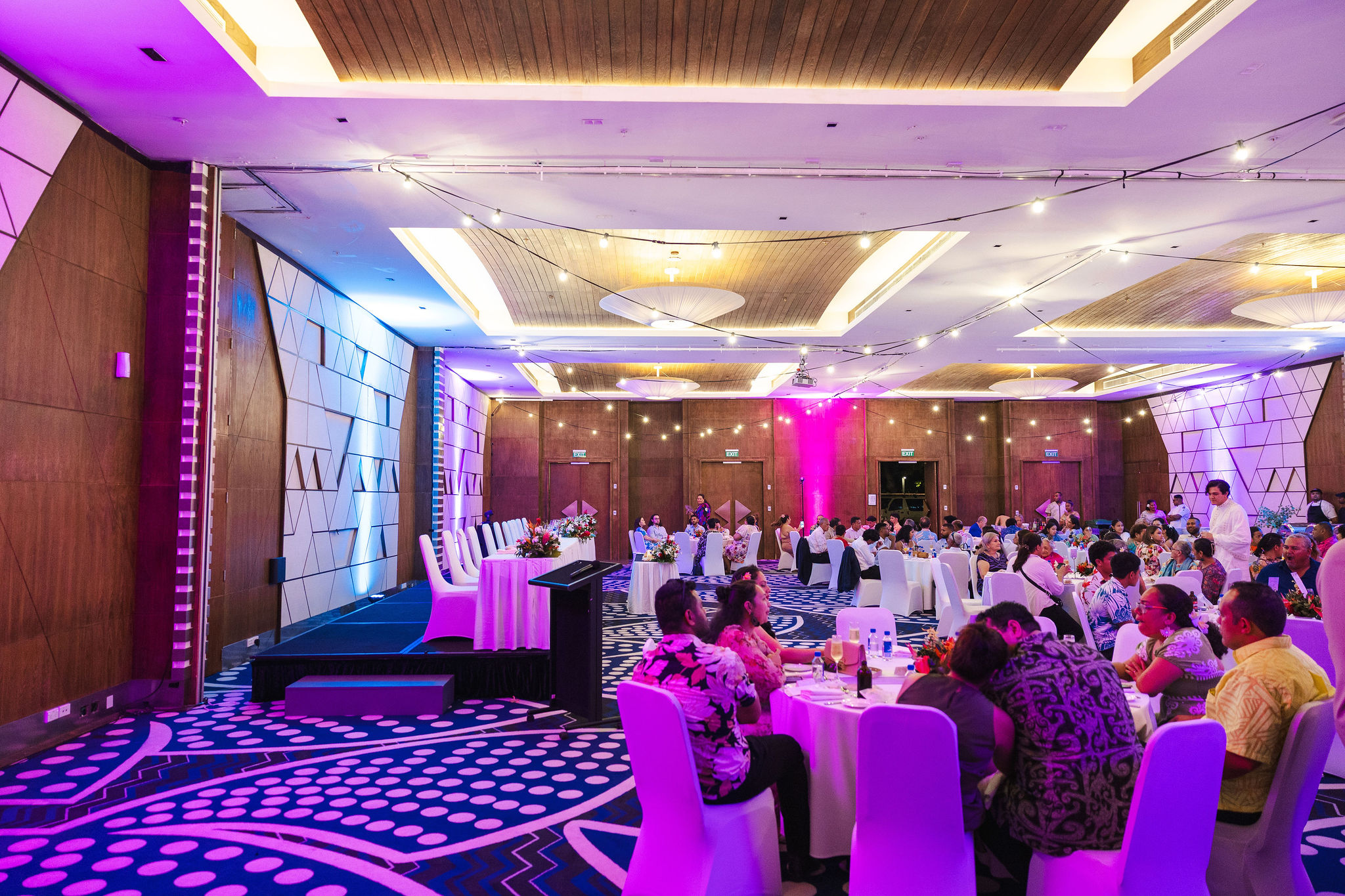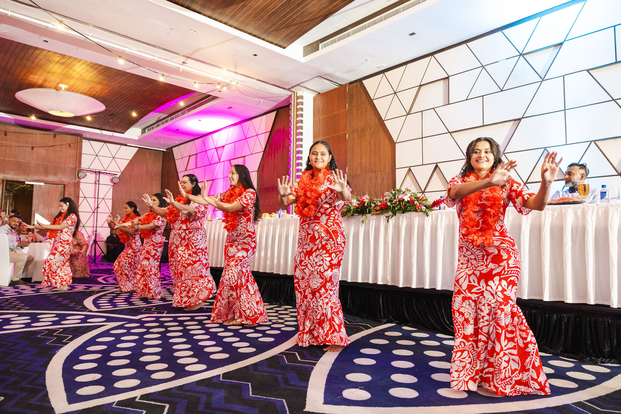 The Reception was at the Crowne Plaza Ballroom. We chose the ballroom because we had a large number of guests and we wanted everyone to be seated comfortably. We had a large head table set-up at the front on a slightly raised stage, and then about 14 or so tables of 8-10 people spread around the ballroom. At the back of the room was a kava station, and the buffet station. There was a DJ in the corner and a drinks station as well. The ballroom is massive, and easily accommodated our 130-140 guests, with a large dance floor space in the middle as well.