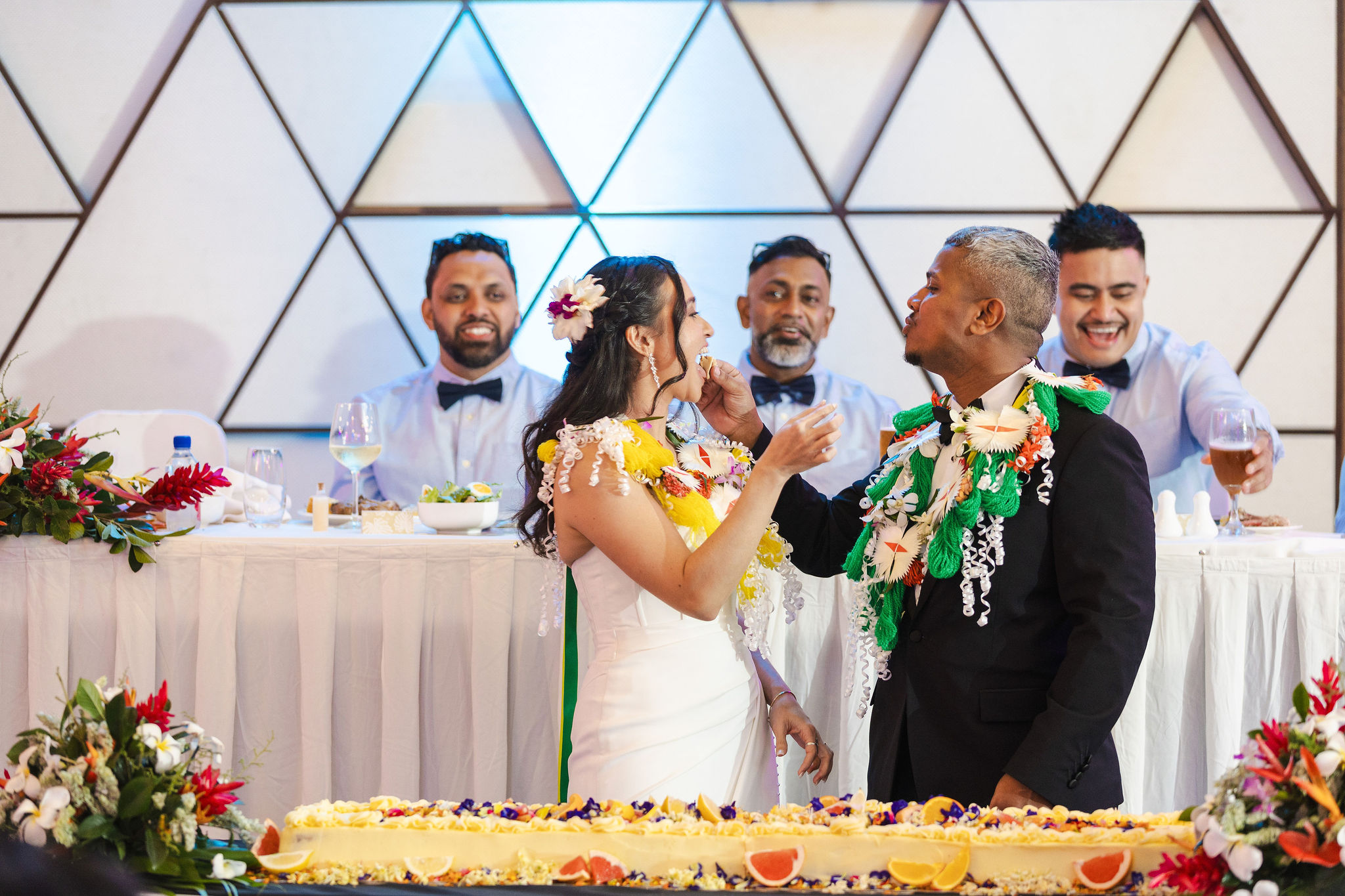 The wedding cake was extra special as it was made by my brother, who runs a boutique baking business in Fiji called Pesto Ernesto. We chose a refreshing lemon and gin flavour, opting for a unique long-style cake rather than the traditional tall tiers.
