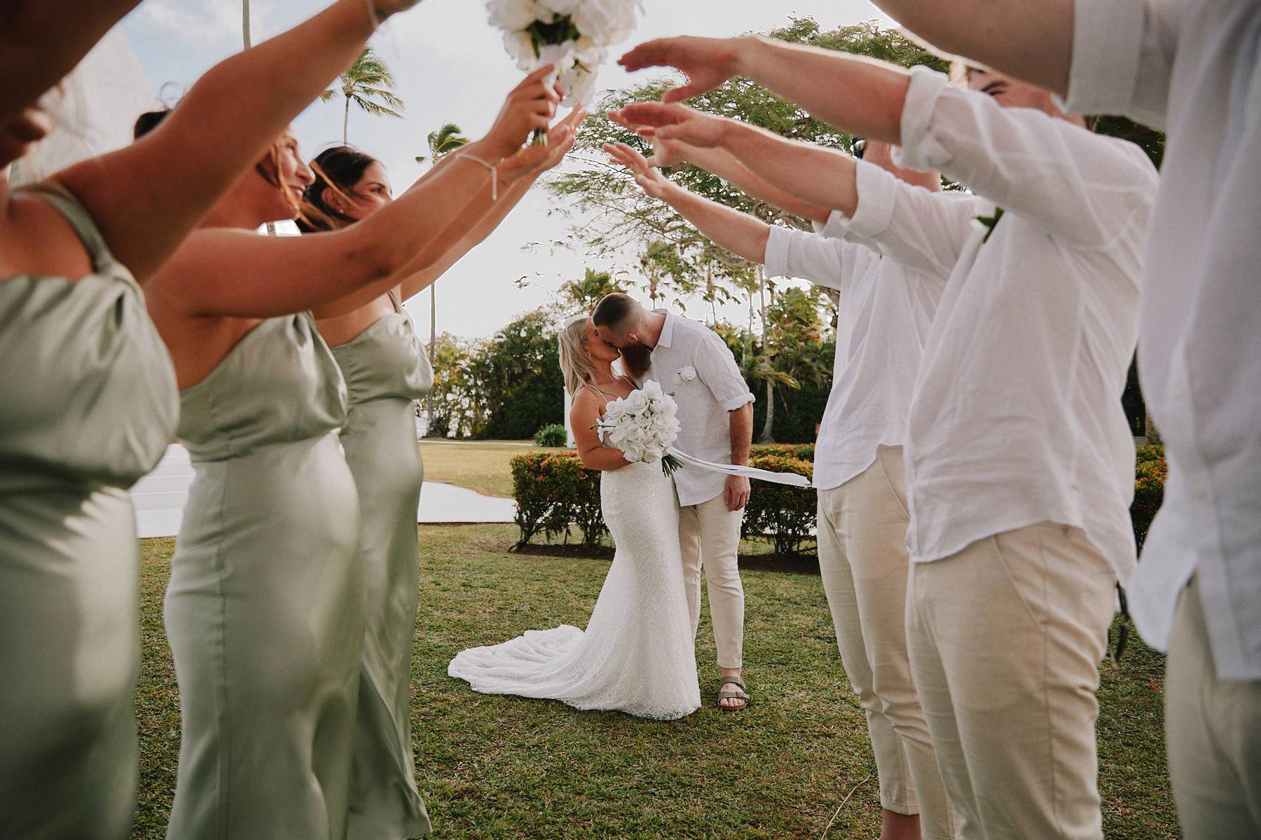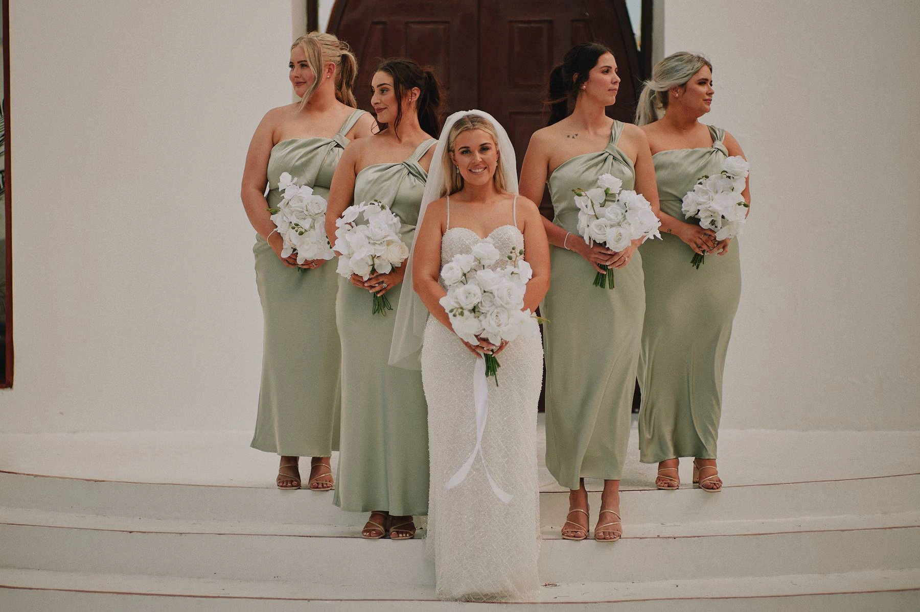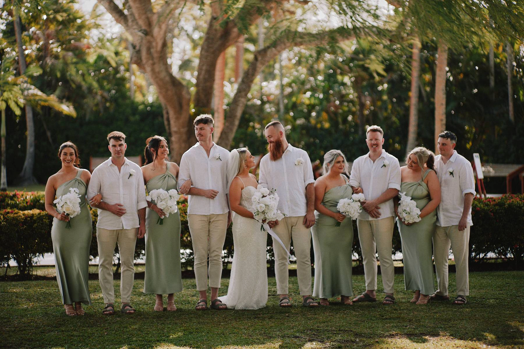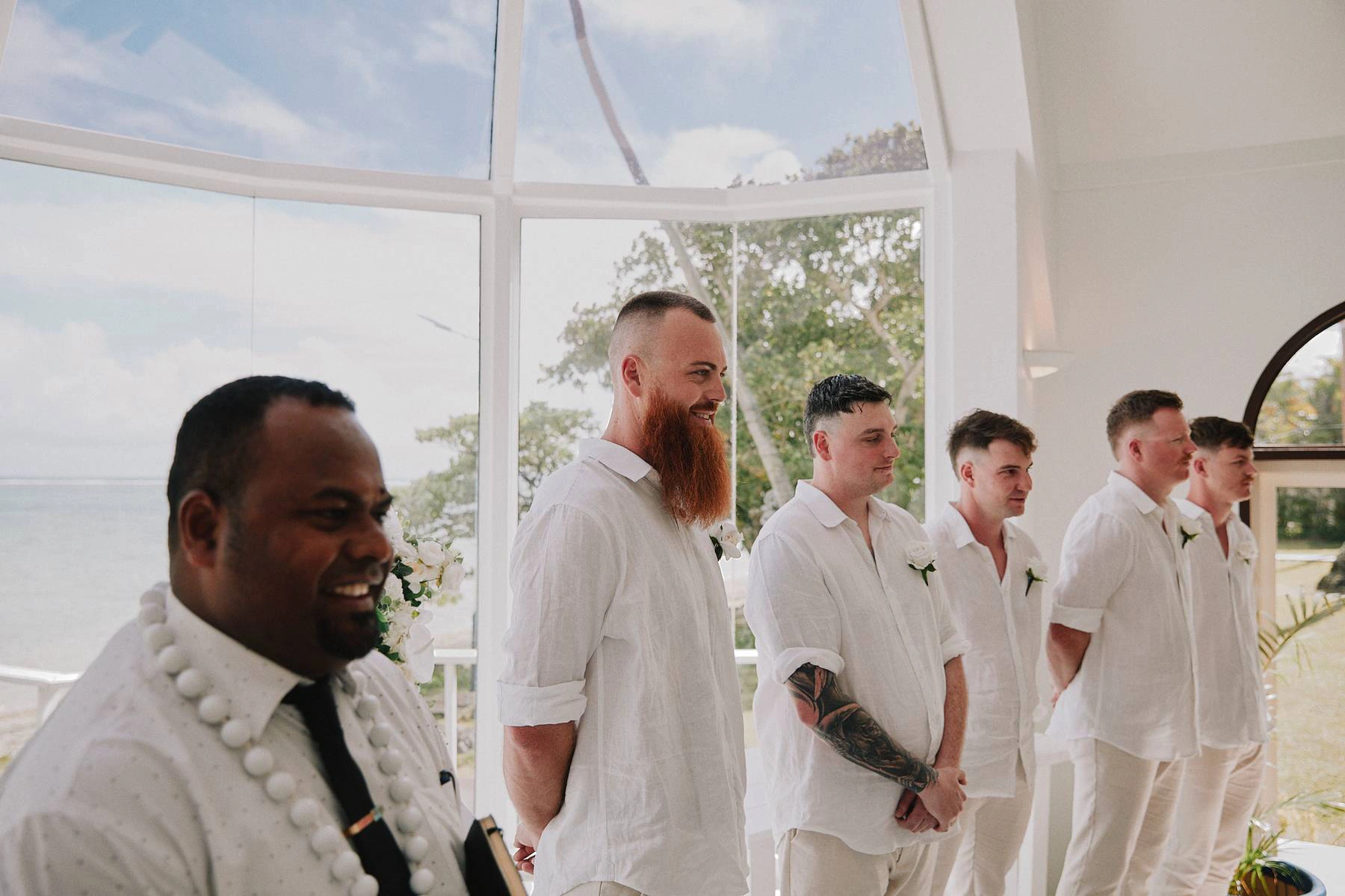 I chose an all-white color scheme for its pure, clean look, adding coconuts to the guest tables as a traditional touch. For a subtle pop of color, the bridesmaid dresses and groomsmen shoes were olive green. I avoided darker colors, as they don’t quite suit the Fijian setting based on photos I’d seen.