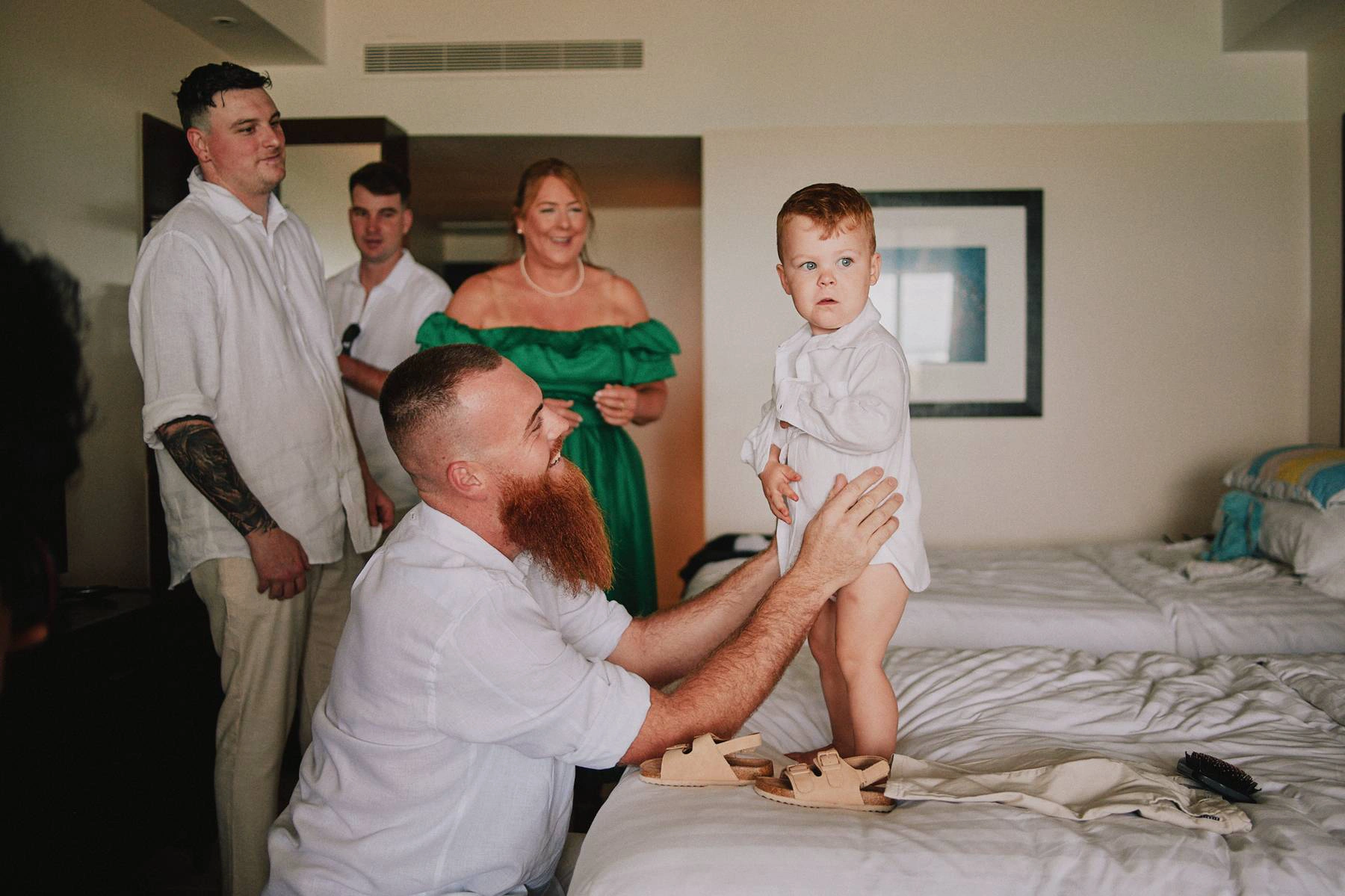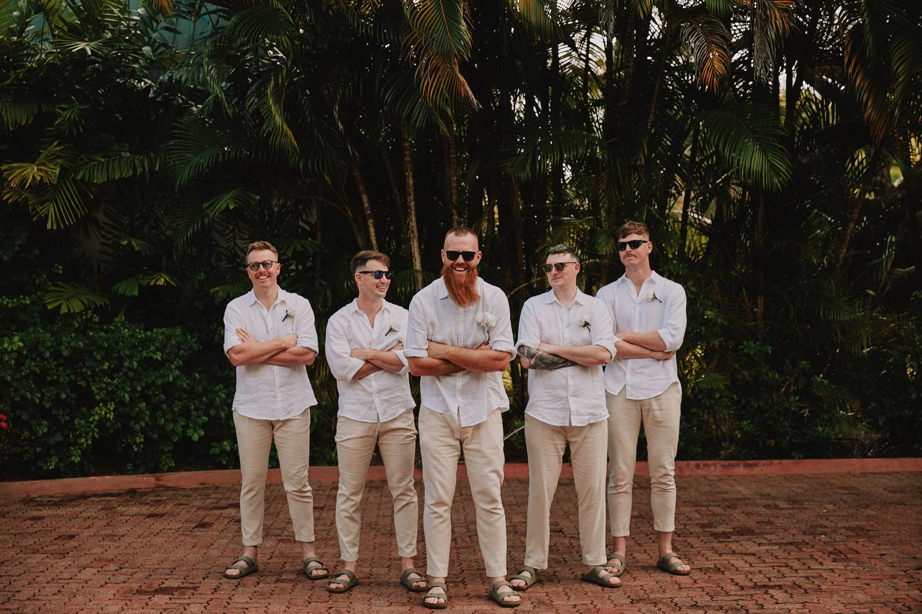 The groomsmen’s shirts were from Industrie, and their pants were from YD. We also got each of them Birkenstocks, aiming for a comfortable, casual look that suited the location.
