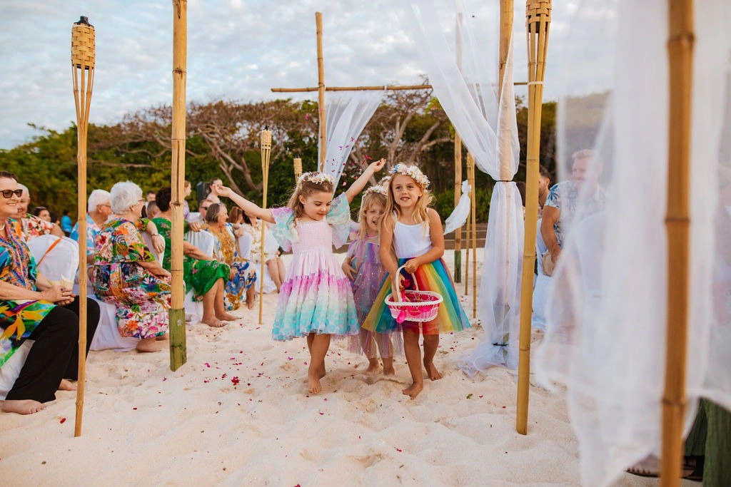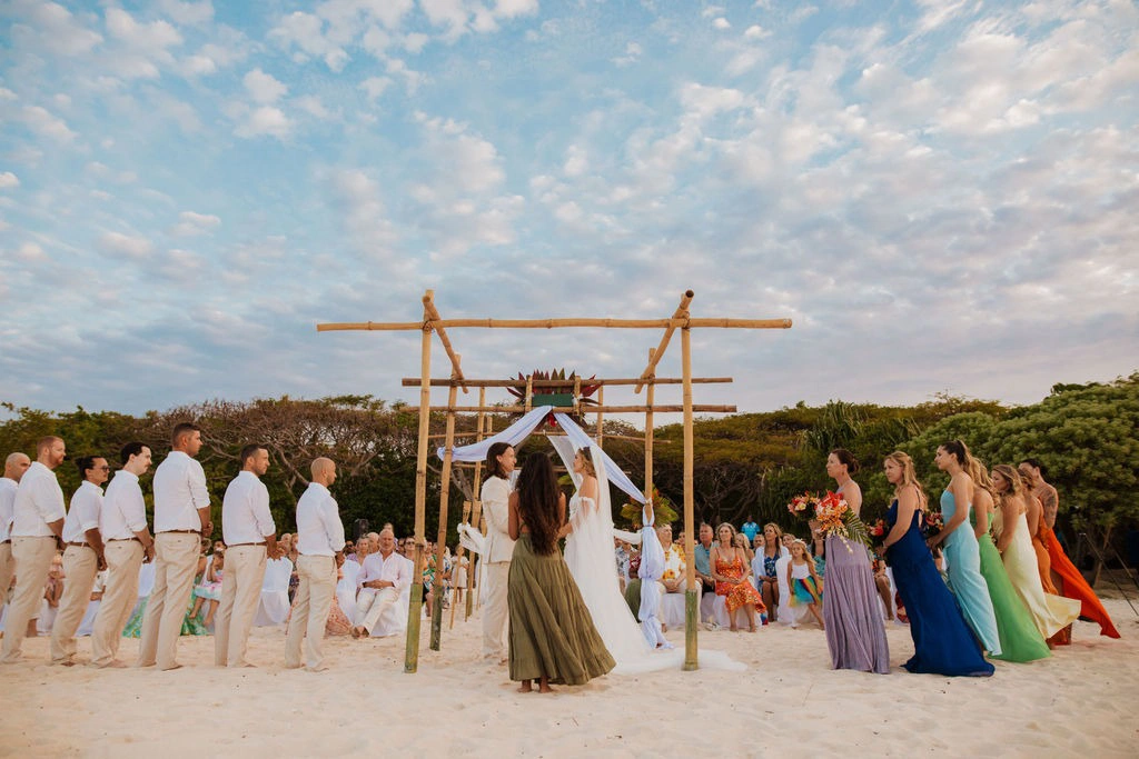 We aimed for a magical and ethereal vibe, with spirituality woven throughout. The ceremony was timed for sunset and tied to the moon phase, set entirely in nature. Our color scheme featured a vibrant rainbow of shades, with guests dressed in bright colors and bare feet. We incorporated Fijian elements like native flowers, a Fijian choir, Polynesian dancing, and a warrior escort for our reception entrance.