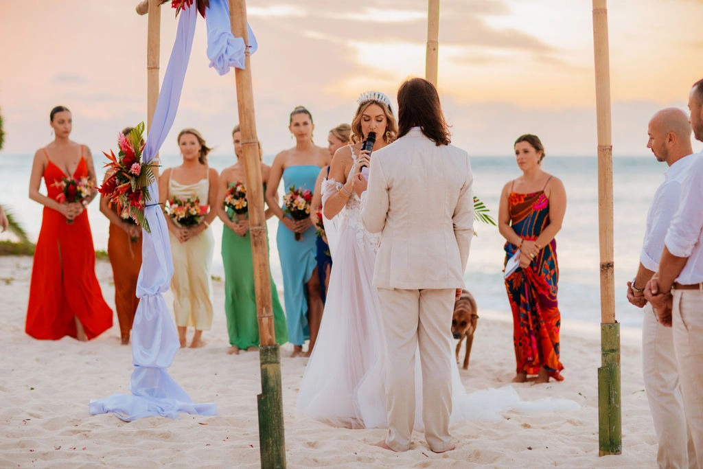 Our wedding was inspired by our love for nature, the ocean, quality time with loved ones, and a good party. We wanted to infuse these elements into a week-long celebration, featuring a sunset ceremony on the beach followed by a reception under the full moon. As a spiritual person, I incorporated unique touches such as a heart-centered meditation instead of a reading, crystals in the decor—including table numbers, nameplates, and my crown headpiece—and a rainbow chakra-inspired color theme for the bridesmaid dresses. Oracle cards and affirmations also added a personal and meaningful touch to the table settings.