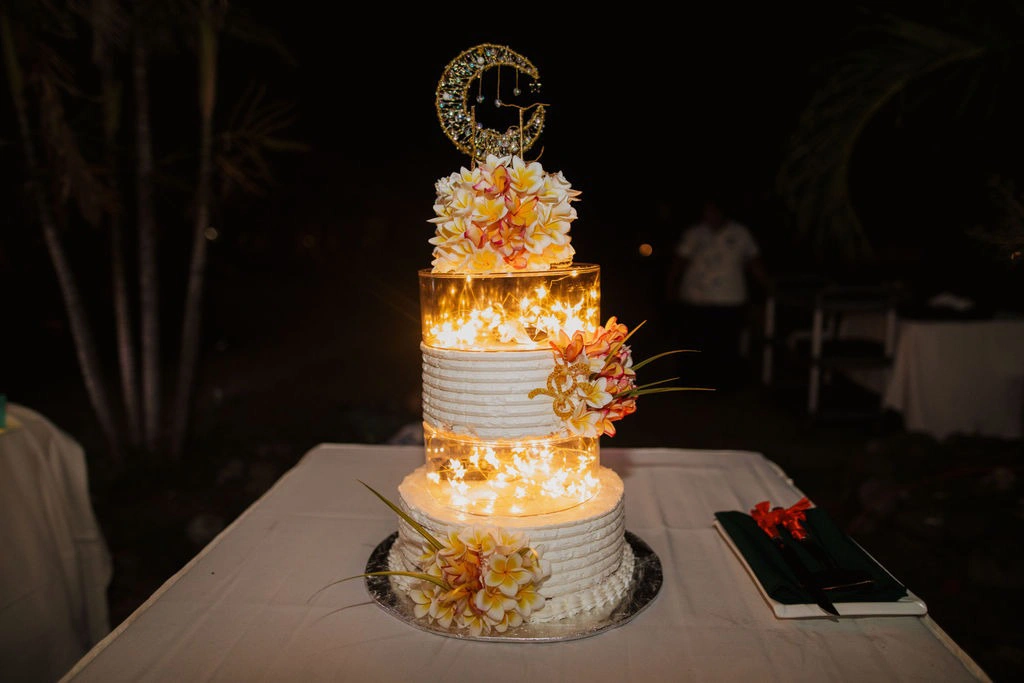 We went for an open bar to keep the party alive and selected a delicious menu featuring seafood and vegetarian options. Mana also created our stunning three-layer cake—vegan, chocolate, and caramel mud cake—topped with a celestial and crystal design handmade by friends Ellen and Alycia.