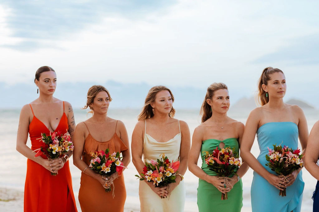 My bridesmaids had so much fun with their dresses! Our theme was a rainbow chakra color pop, so each bridesmaid chose a different shade and style that suited them. The only rules were no fast fashion and no short dresses, and despite being spread across the globe, it came together beautifully.