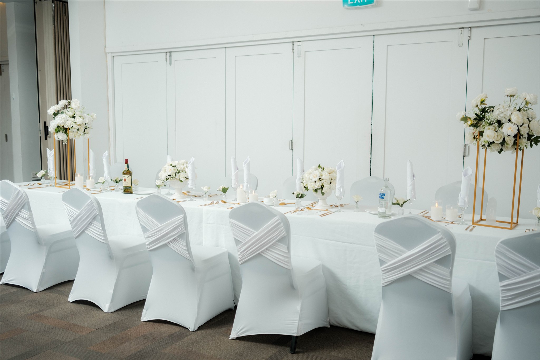 For the wedding ceremony, we envisioned timeless elegance. A white and gold colour palette gave the space an ethereal feel, while the mirrored walkway added an unforgettable wow factor. Walking down it felt truly magical and brought our entire ceremony vision together.