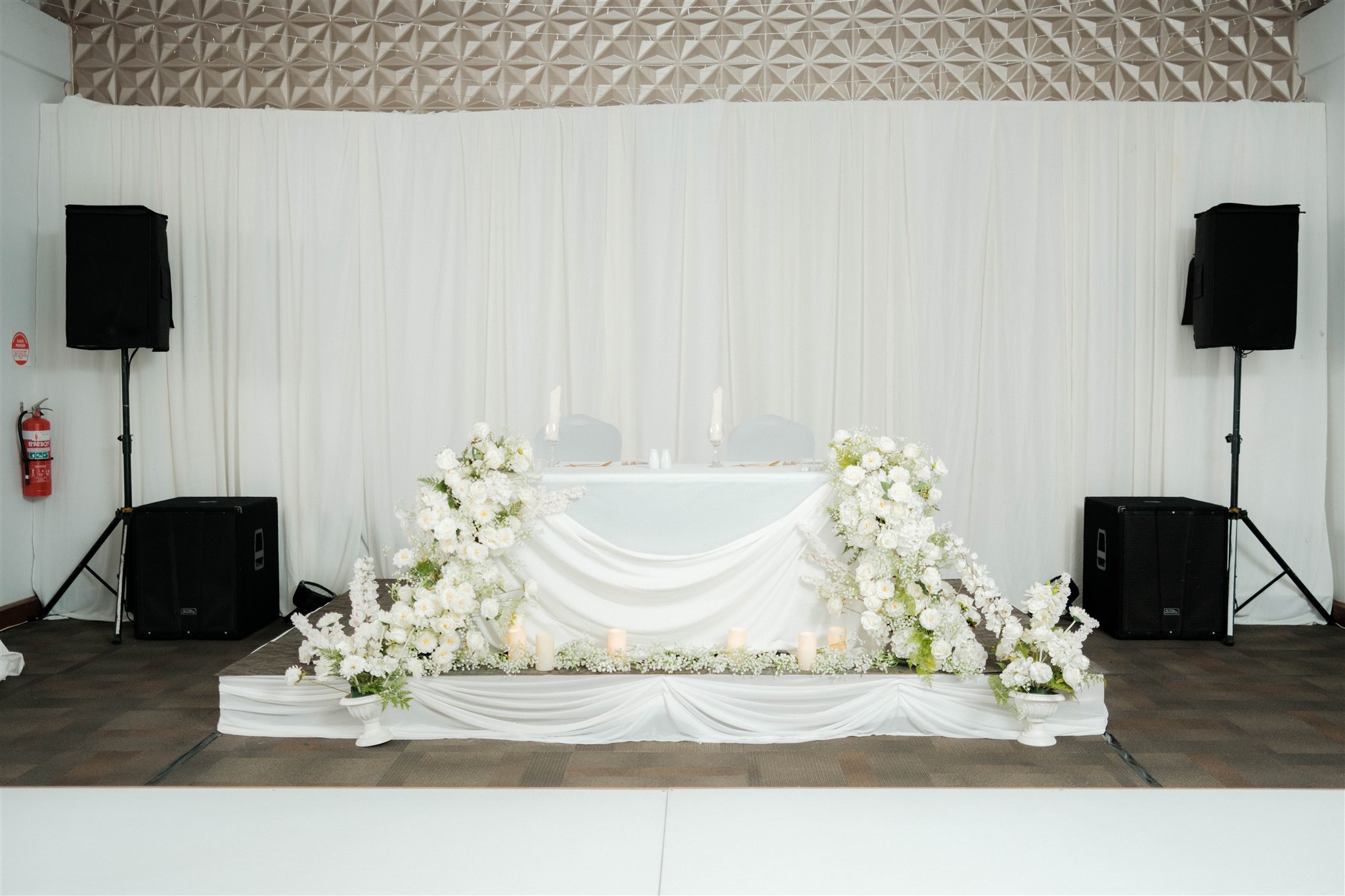 The décor was styled by The Wedding Shop, and our vision was candlelit romance with a timeless, elegant atmosphere. We kept the look refined and warm, leaning into a western aesthetic that felt classic rather than overdone. One of our favourite features was the dance floor with custom decals — it truly became the heart of the room and set the tone for the night. We also added a photobooth, which blended seamlessly into the décor while giving guests a fun, relaxed way to create memories.
