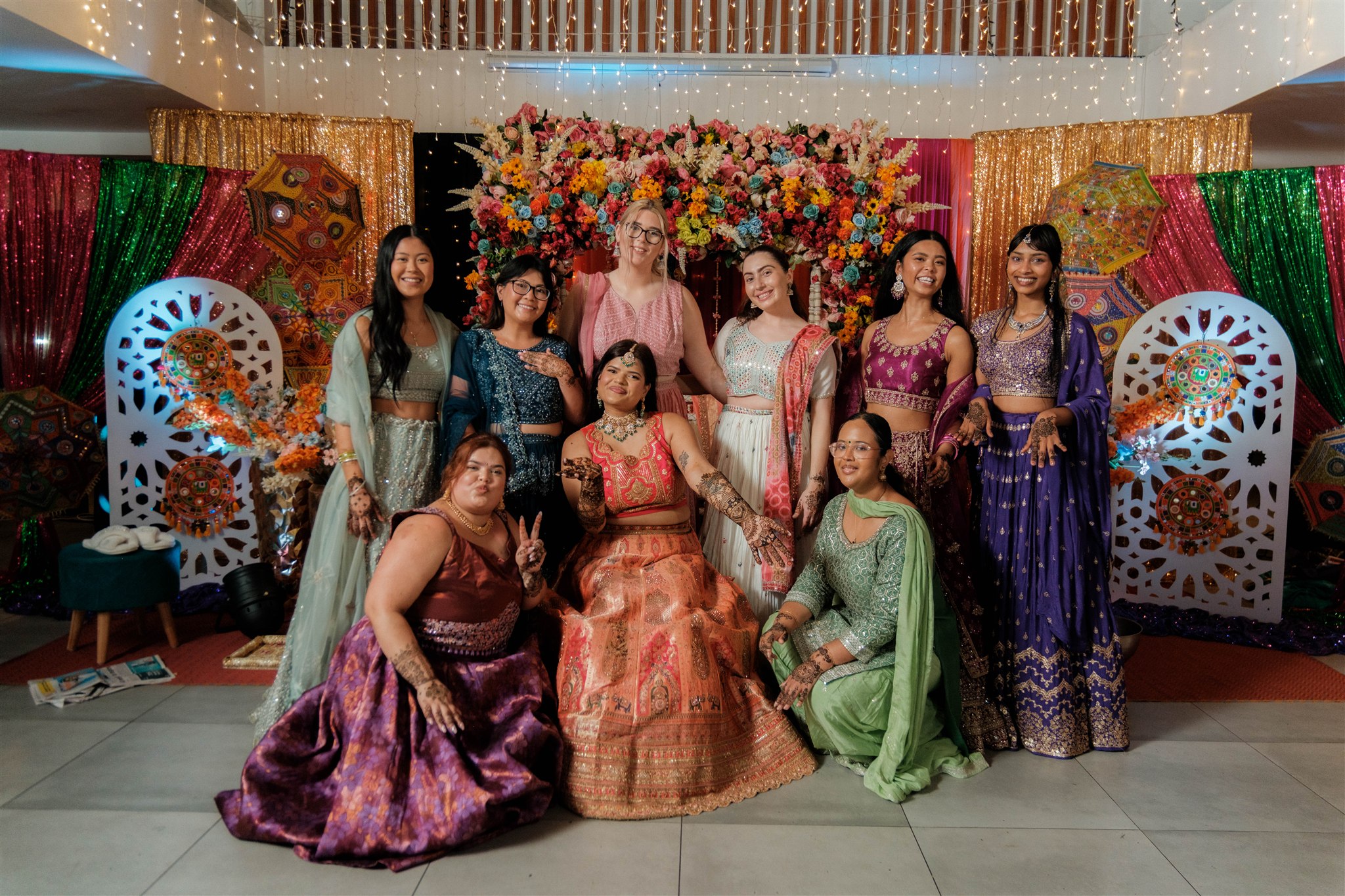 For our Mehndi Night and Haldi ceremony, I kept things personal and meaningful by doing my own makeup, with my sister taking care of my hair. For the wedding day and reception, my hair and makeup were done by Sydney-based HMUA Aditi Makeovers, while my bridesmaids were looked after by Lodoviko and team.