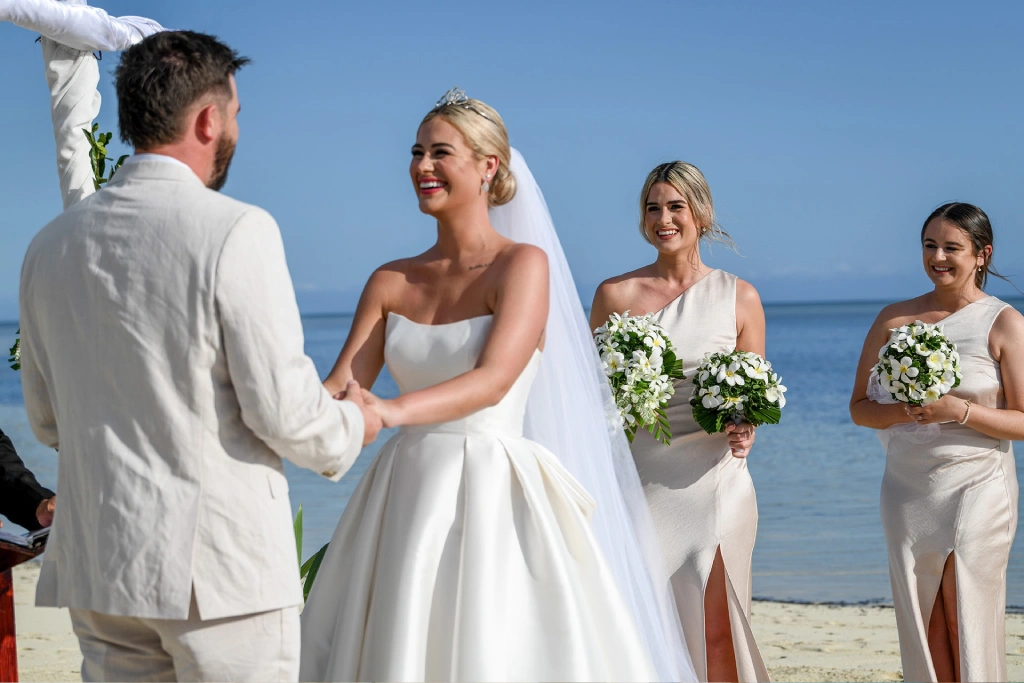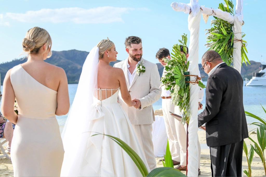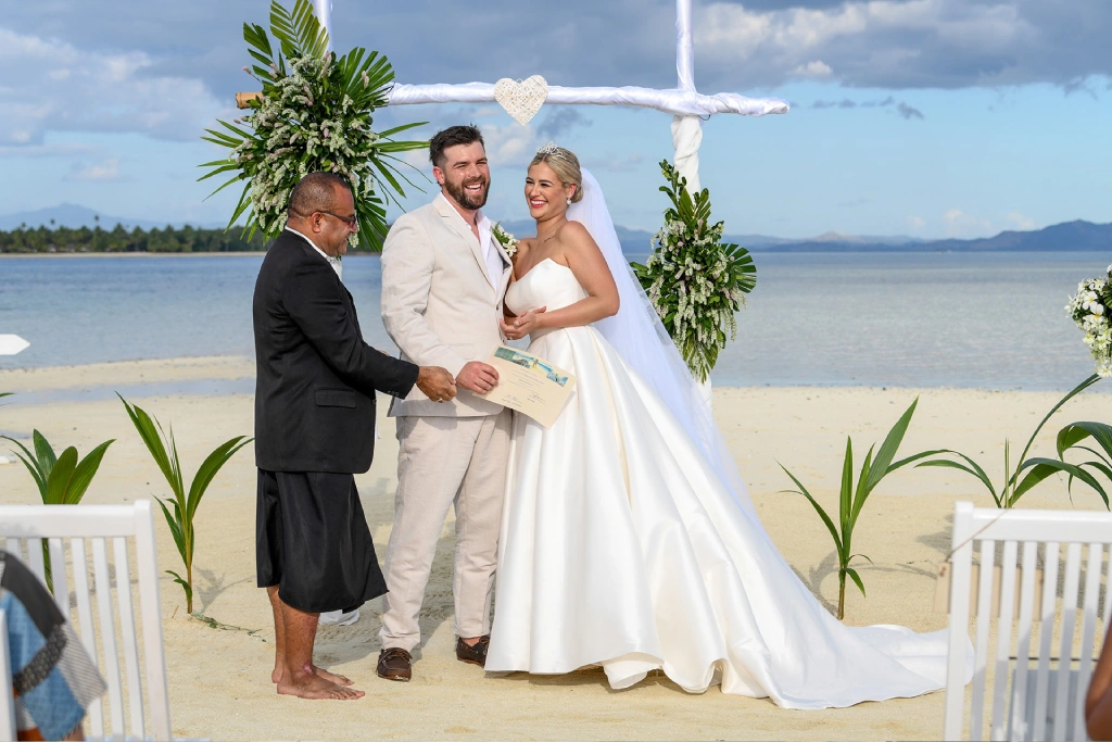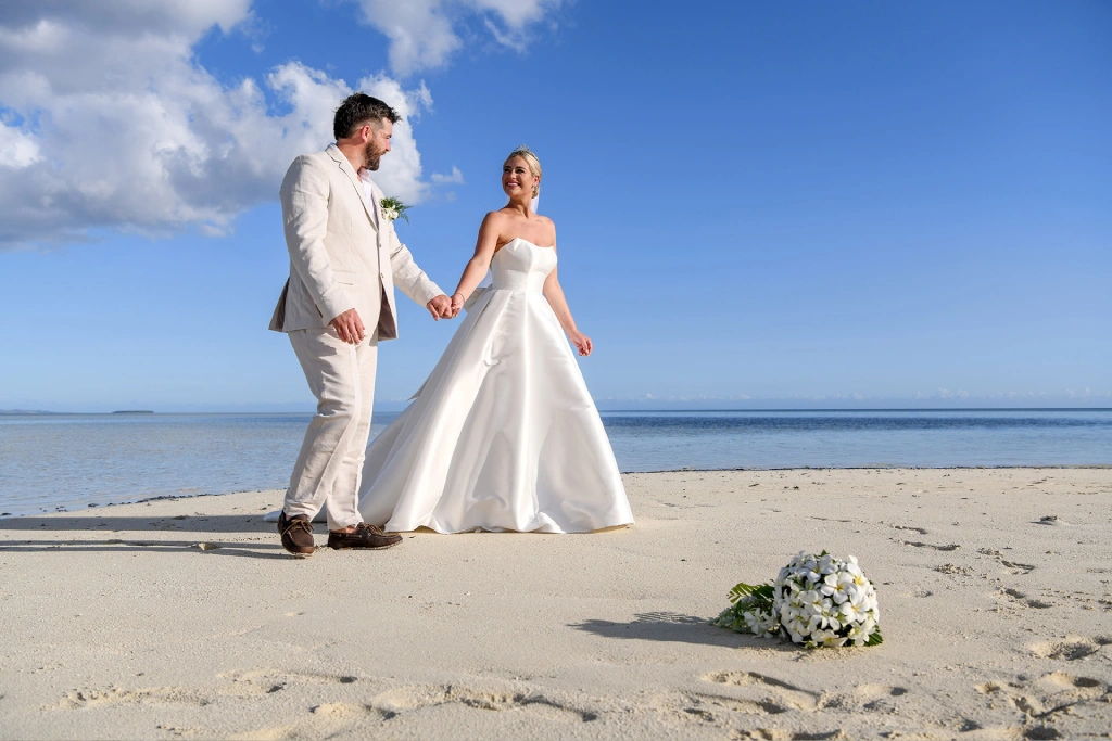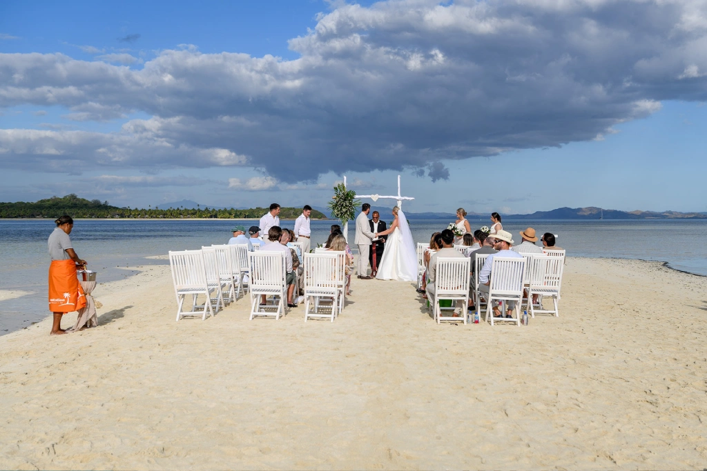 We chose Plantation Island Resort on Malolo Lailai Island as our wedding location. With several nearby resorts, it offered our guests a variety of accommodation options if they wished, and it allowed us to enjoy different dining experiences. We couldn’t be happier with our choice! The sandbank ceremony at Plantation Island Resort provided the most magical setting for our vows.