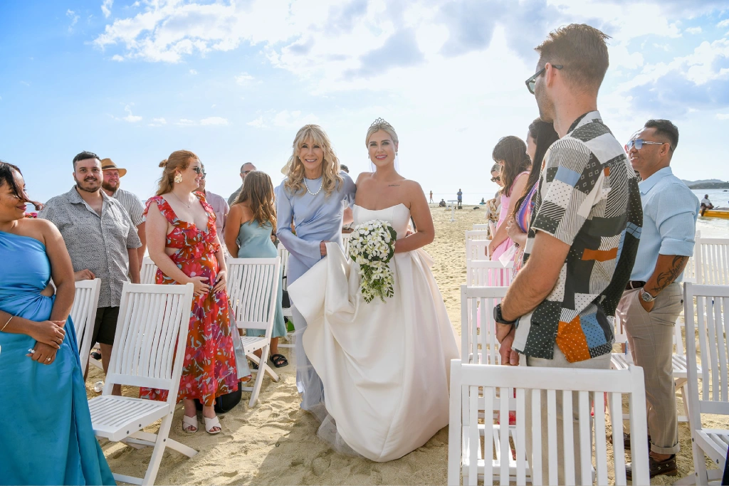 Our ceremony took place on the breathtaking sandbar at Plantation Island Resort—a longtime dream of being surrounded by crystal-clear blue water and pristine white sand. Plantation Island Resort provided and beautifully set up all the decor for the ceremony. We chose a color scheme of white and gold, accented with touches of greenery in the floral arrangements, creating an elegant and natural feel.