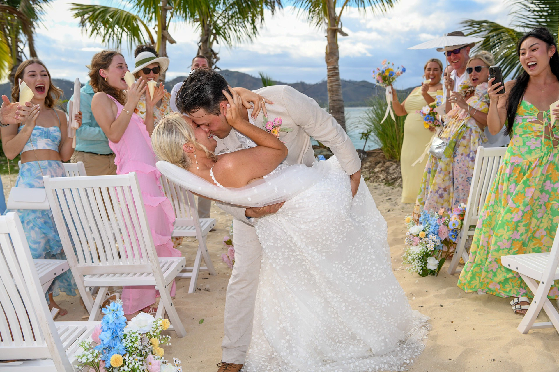 We were very DIY! We bought all our own decorations, fake florals, white umbrellas, fans and confetti and used all the white chairs provided from Plantation Island Resort. We ordered our bouquets from the Bridal Collective. And all fake florals used in aisle were from Shein. We wrote our own vows.